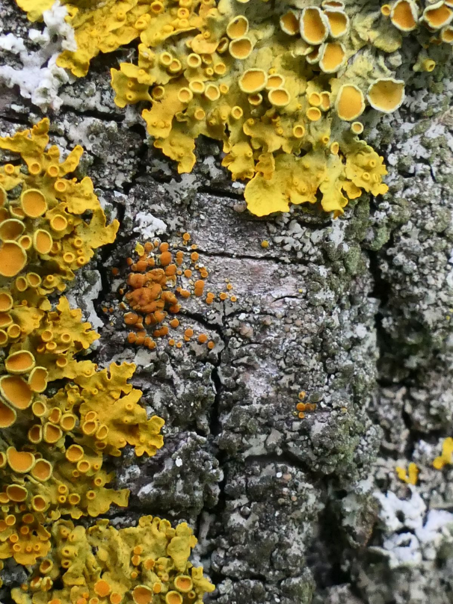 Auf der Borke eine Flechtengemeinschaft aus Xanthoria parietina, Physcia adscendens, Phaeophyscia orbicularis, Lecidella spec (unbestimmt) und verm anderer gelbfrüchtiger Caloplaca spec (unbestimmt, nicht in Bild 1).
