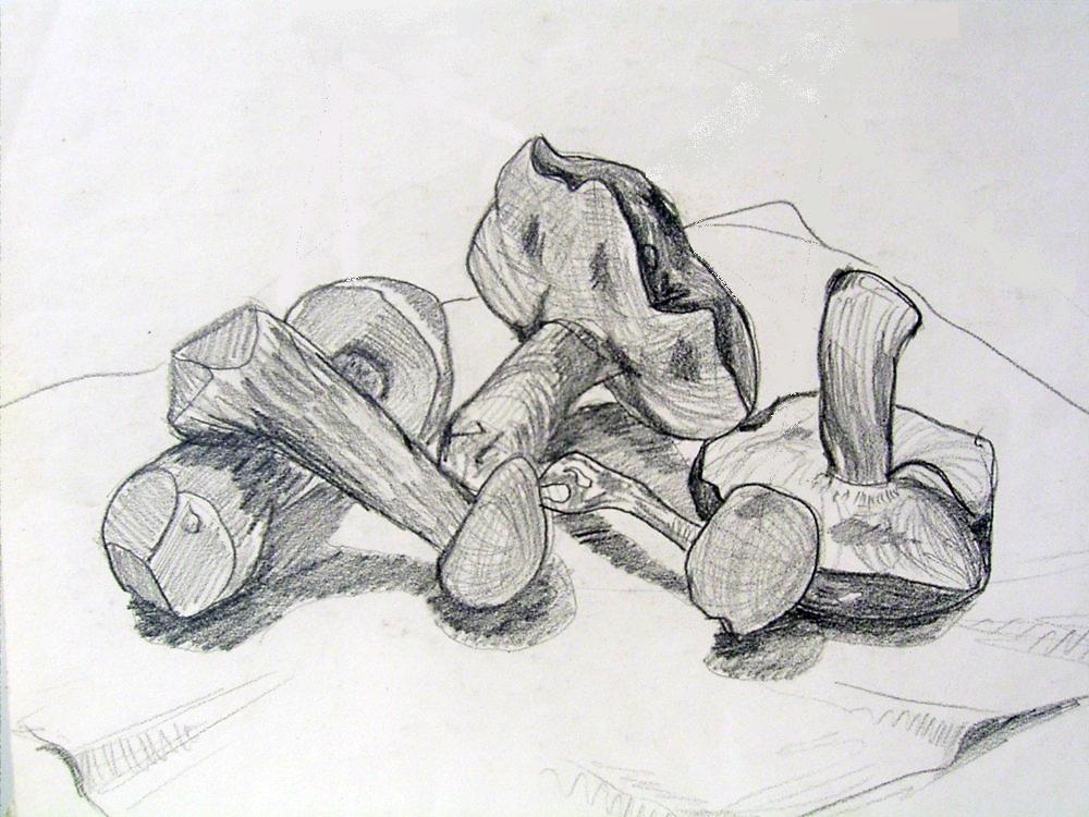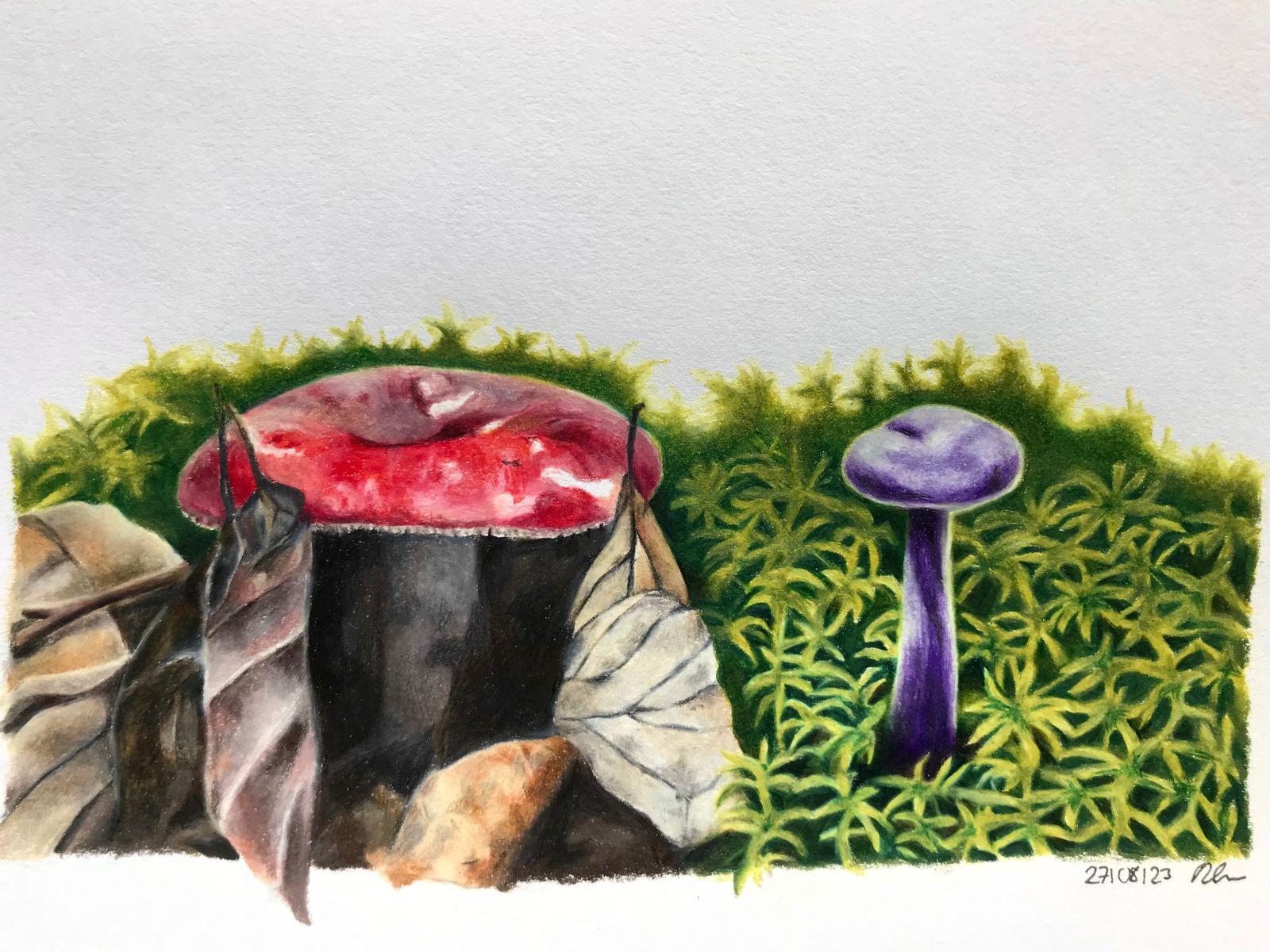 Da ich gerade so viele schöne Täublinge und Lacktrichterlinge im wunderschönen Moos wachsen sehe, habe ich ihnen ein kleines Protrait gemalt (Bundstiftzeichnung).