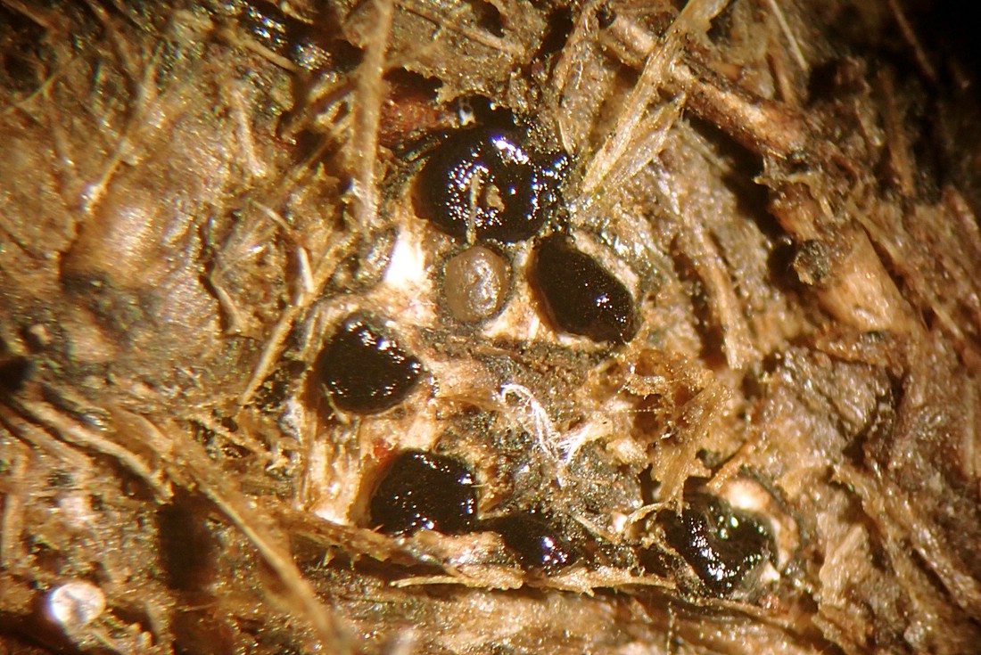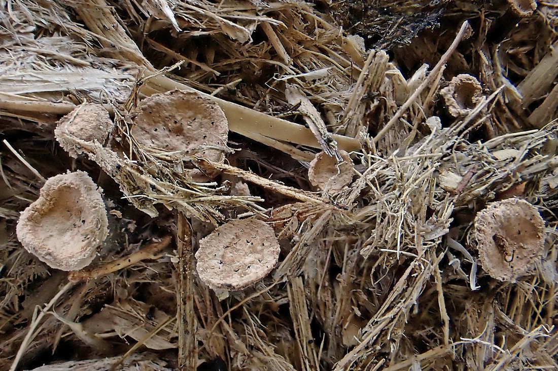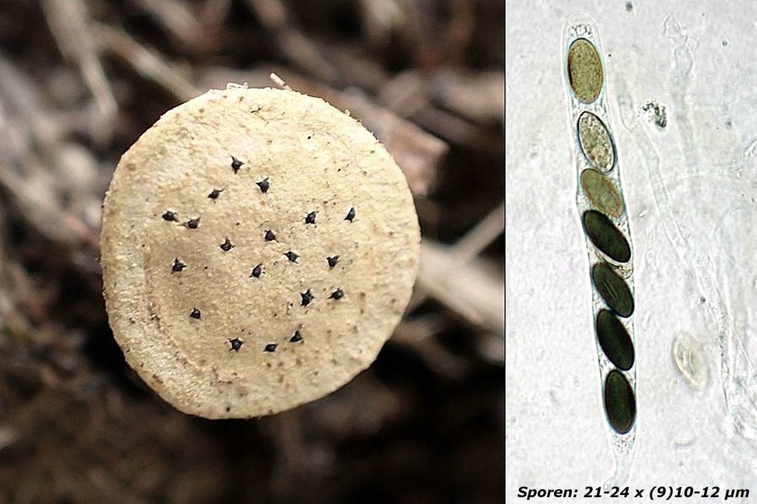 Ebenfalls neu für die Senne und vermutlich für NRW ist Hypocopra stephanophora. Auch diese Art benötigt aufgrund ihres Fruchtkörperbaues eine längere Entwicklungszeit und wird demzufolge nur an altem Dung gefunden. Typisch sind einzellige, einseitig leicht abgeflachte Sporen mit einer kurzen Keimspalte sowie das Vorkommen mehrerer Perithecien in einem großflächigen Stroma. Die Species ist laut Pilze-Deutschland lediglich mit vier Funden hierzulande bekannt (Sachsen-Anhalt und Thüringen)!