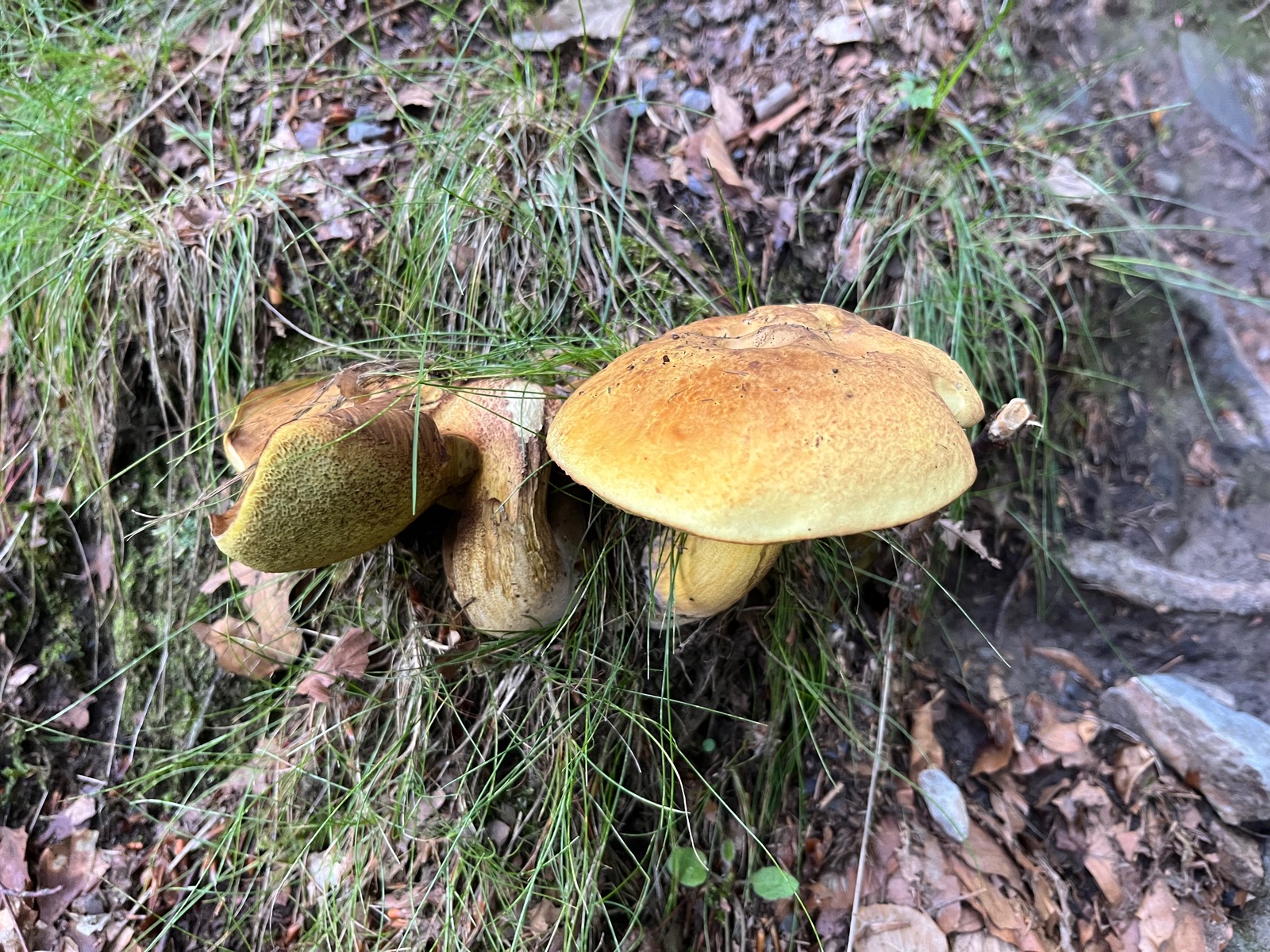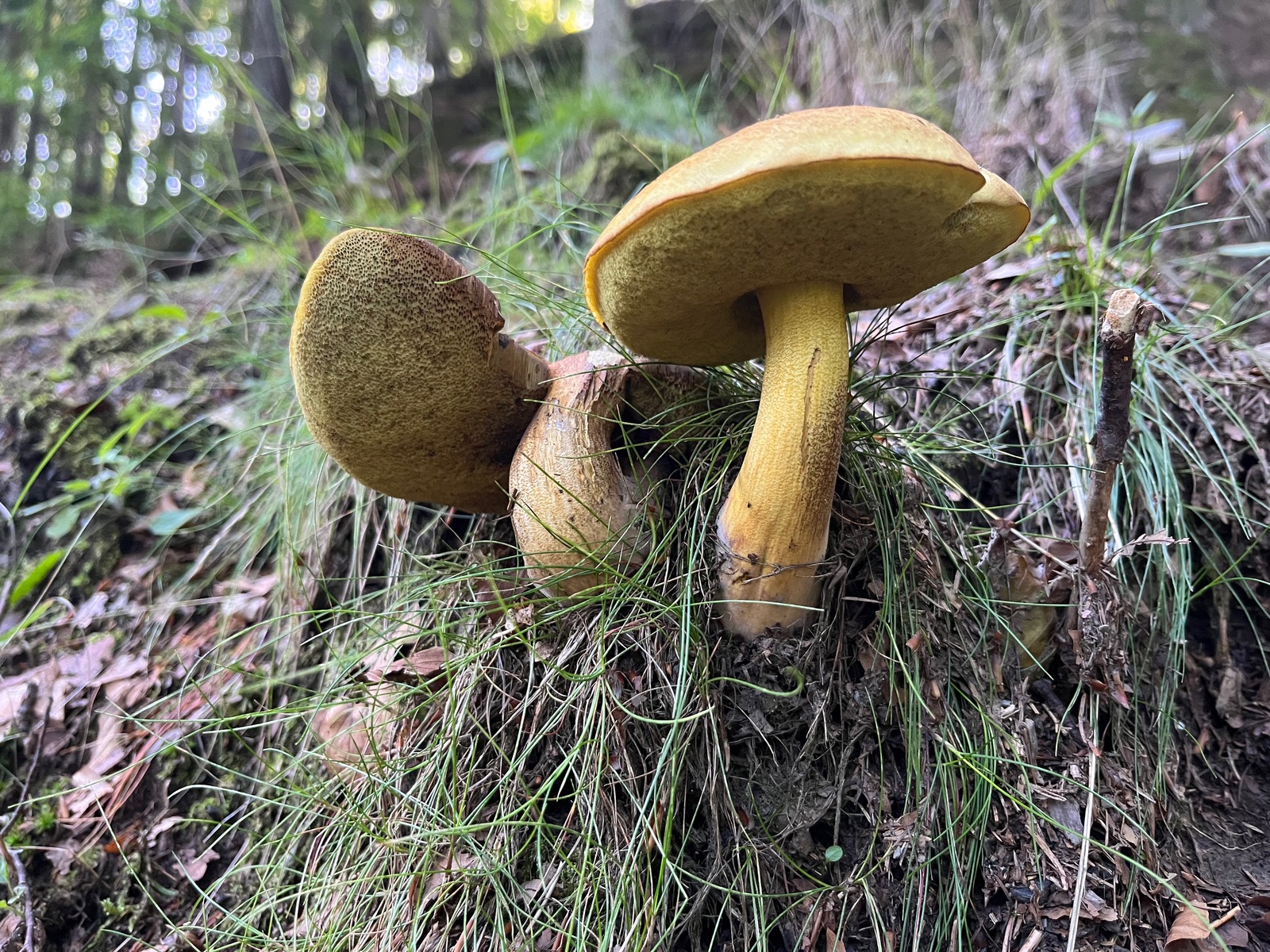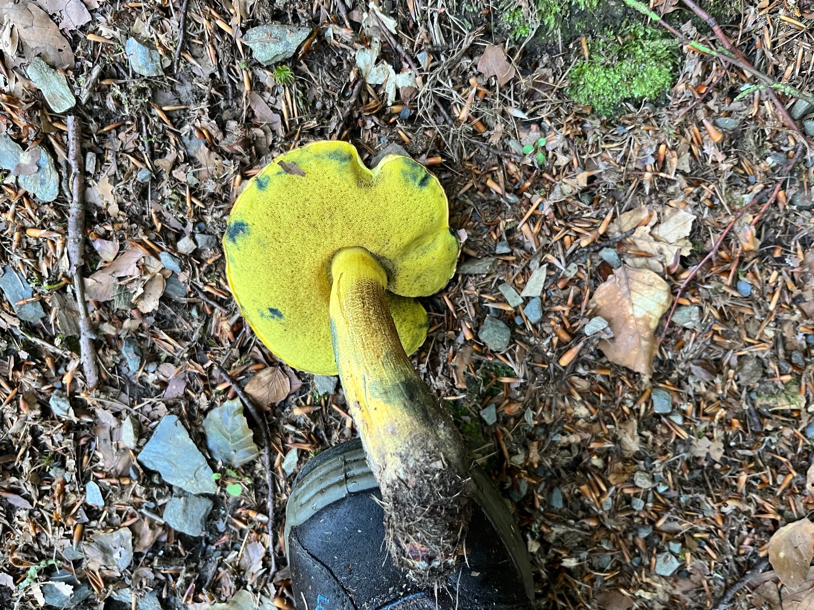 letztens habe ich für eine Freundin ein paar Pilze als Mitbringsel gesucht. Perlpilze, Flockis, Täublinge, Maronen, das Übliche. Dabei entdeckte ich einen hübschen Röhrling, den ich wegen des starken Blauens zunächst für einen farblich abweichenden Flockie hielt. Ich fotografierte ihn und legte einen ins Körbchen. Erst zu Hause habe ich meinen Fund genauer untersucht. Dabei viel mir auf, dass der ja vollkommen gelbe Röhren ohne auch nur einen Anflug von Rot an den Röhrenmündungen hat. Also kein Flocki. Der Pilz stand bei Buchen, Fichten und Lärchen. Kein Netz, saurer Booden. Rostbraune Flöckchen am Stiel. Alte Verletzungen röten etwas (vgl.1. Foto linker Fruchtkörper oben). Der Pilz blaut sofort und intensiv bei Berührung und im Schnitt, wie Hexenpilze.