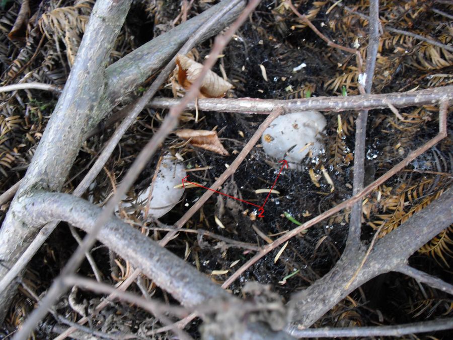 Fundort: Garten; auf dem Boden; unter Kirschbaum, Eibe, 5 Fichten, Holunder, Hasel; Liguster, Efeu, Rose, Walderdbeere, Rasen in der Nähe.
