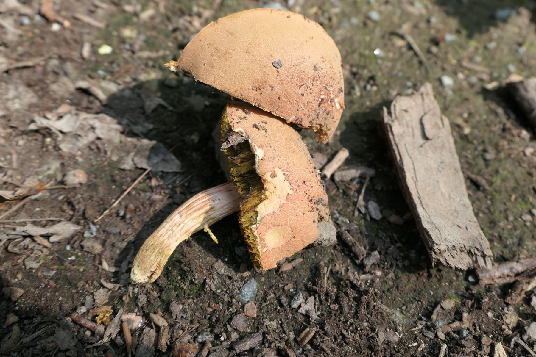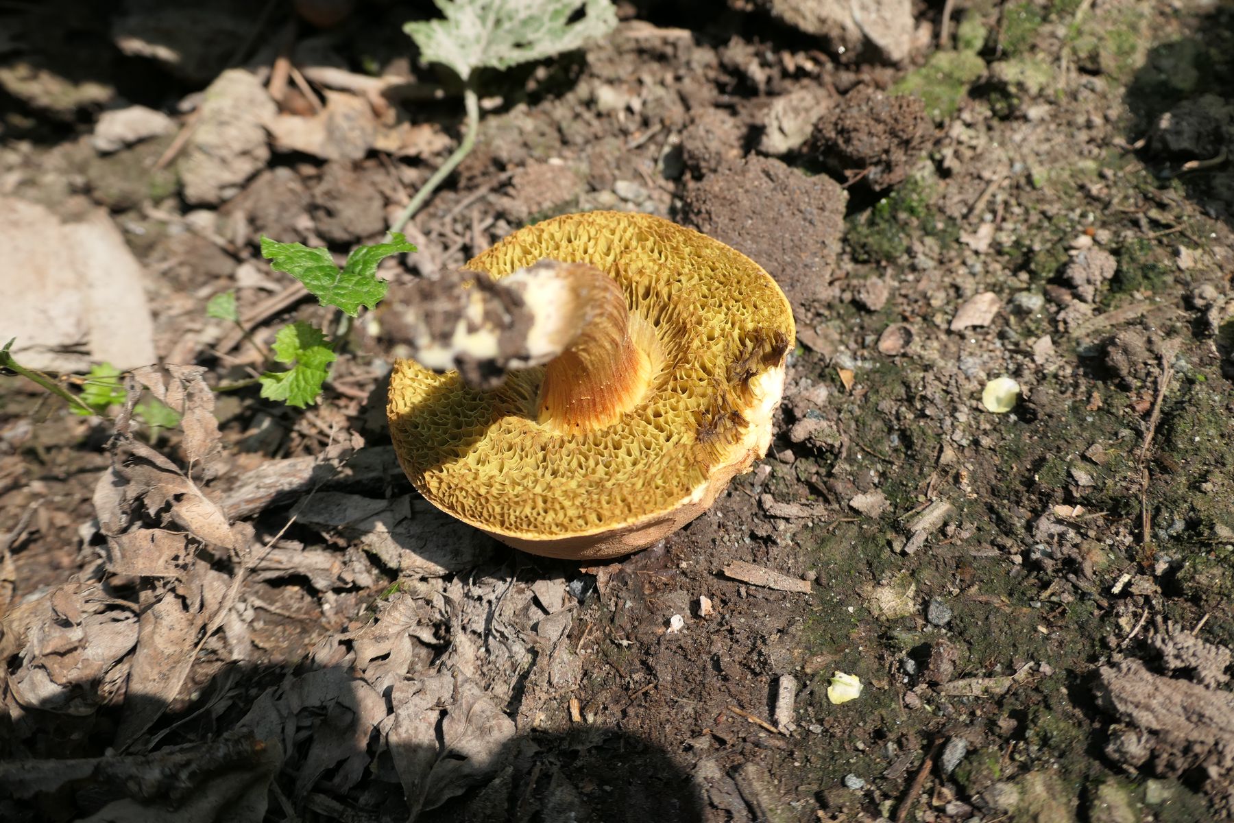 In den paar Minuten im Wald hat er nicht geblaut. Da das Hutfleisch unter der Huthaut nicht rosa ist und so viele Eichen darumstanden, würde ich H. engelii vermuten.