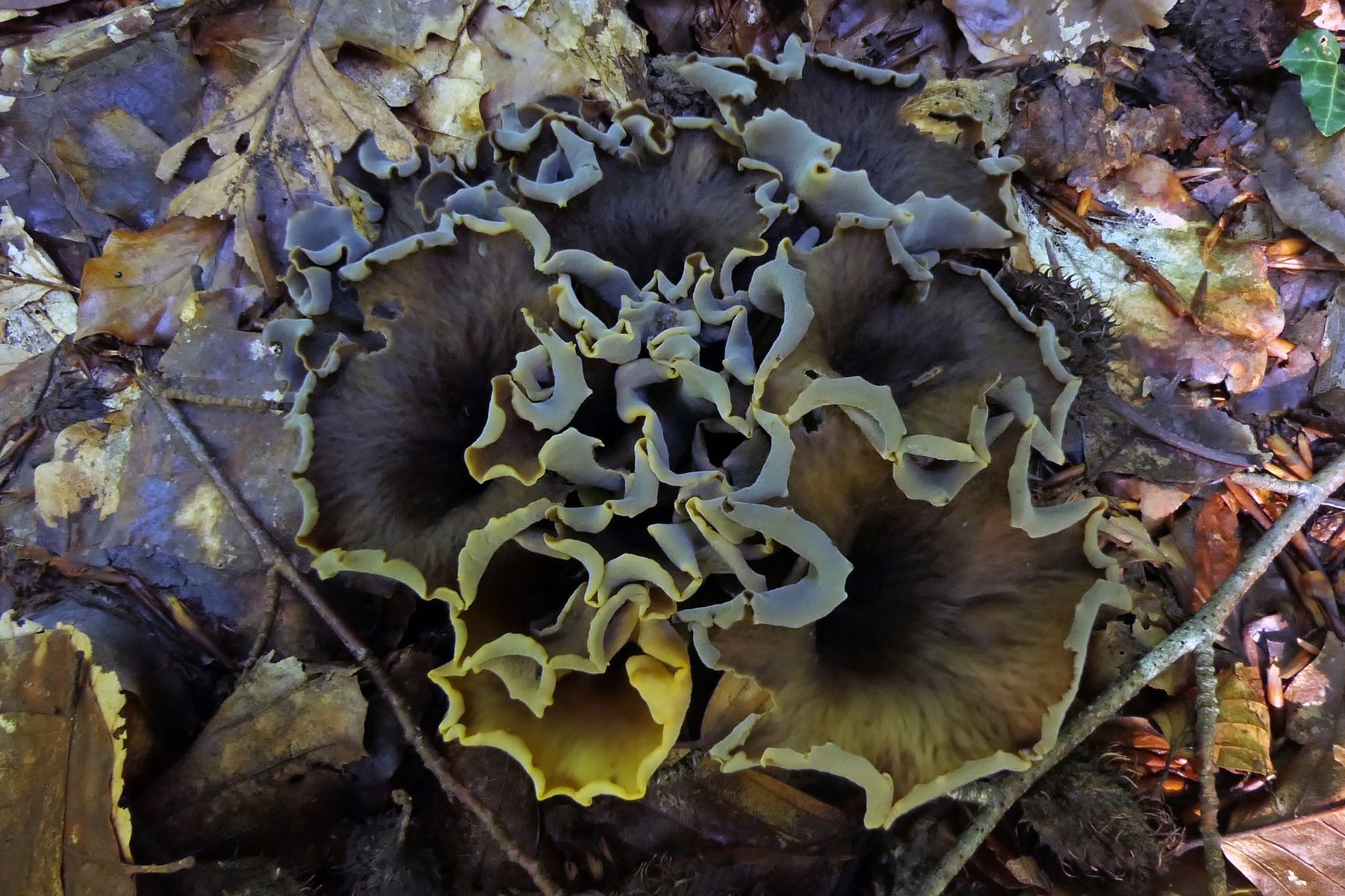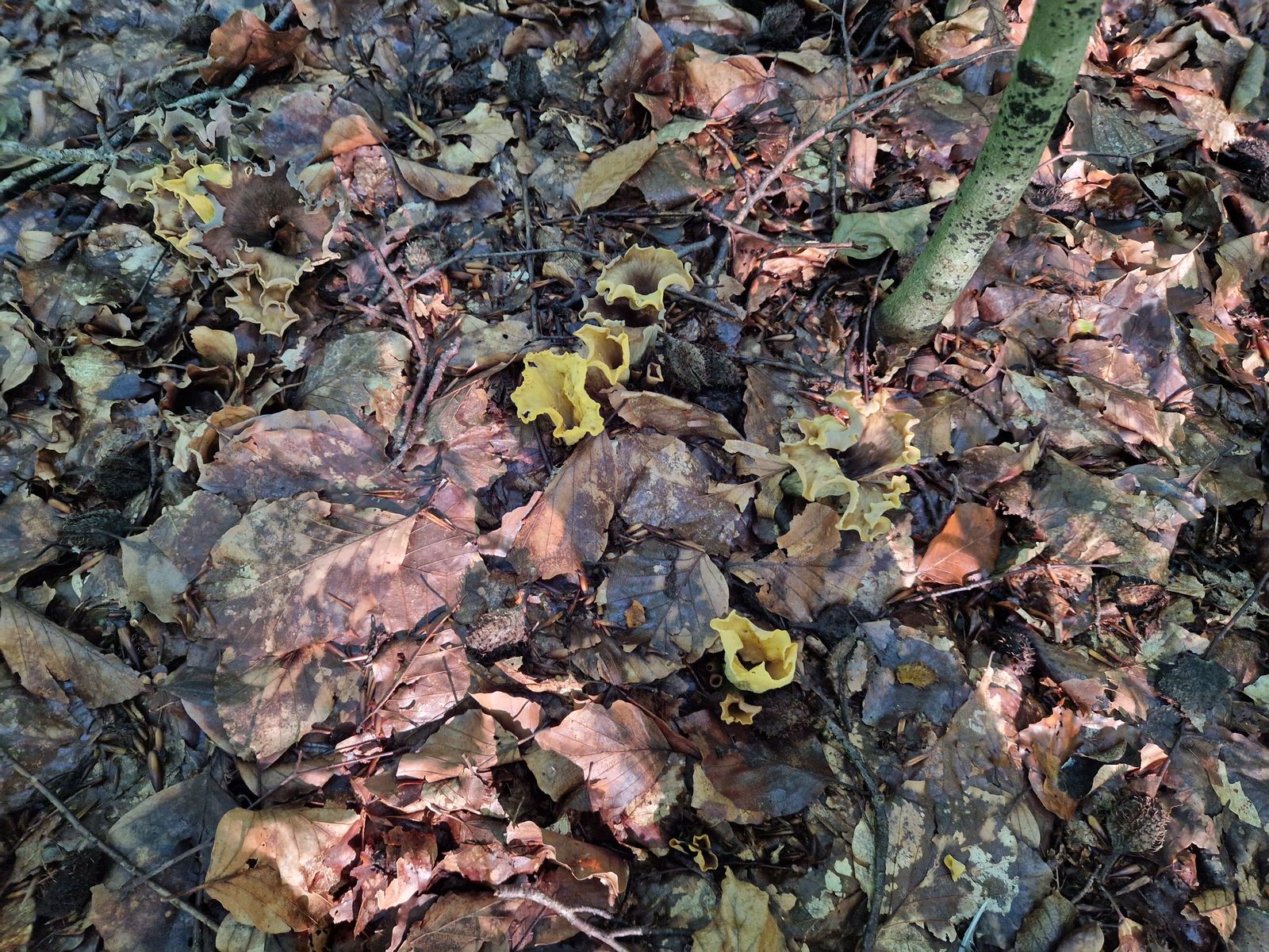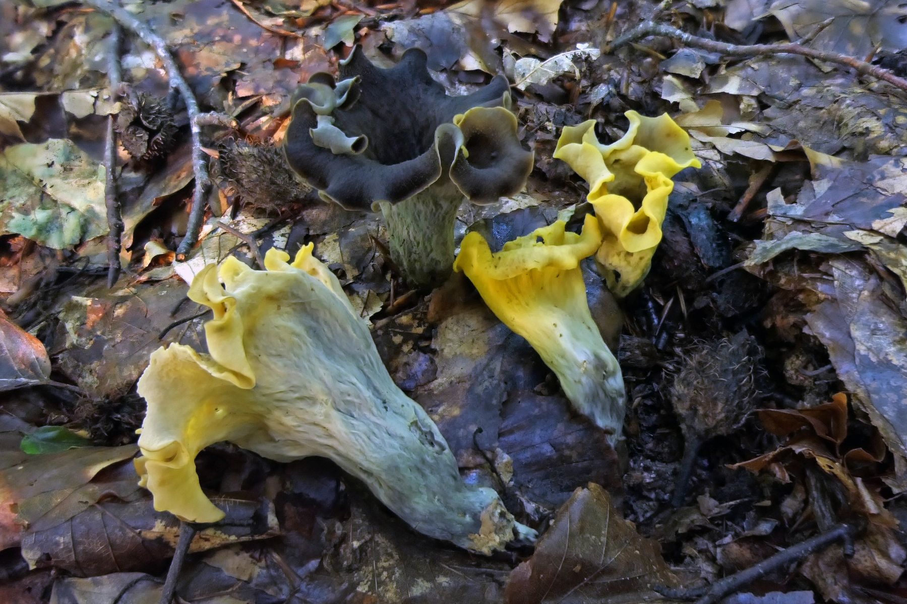 Gestern gab es dann wieder eine Überraschung, mit welcher ich mich ersteinmal auseinandersetzen musste. Ein Areal mit zahlreichen Fruchtkörpern einer Kraterelle, die sich mir aufgrund der Fruchtkörper mit von kräftig gelb, bis schwarz reichenden Fruchtkörpern nicht direkt erschließen wollte. Die schwarzen Fruchtkörper erinnerten schon an die Totentrompete, aber es gab eben auch massiv gelbe und Übergänge. Hier mal ein Überblicksbild (die schwarzen Fruchtkörper muss man suchen, sind extrem gut getarnt):
