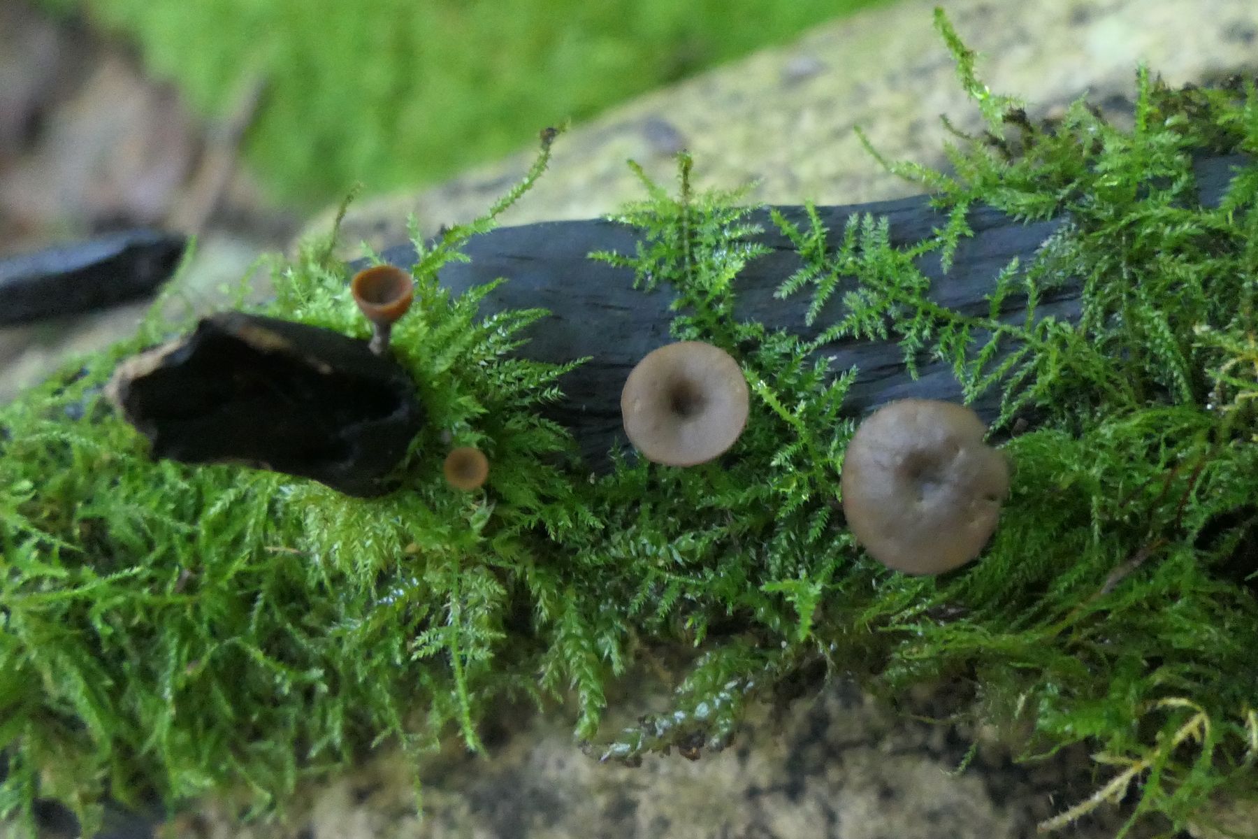 Dann noch etwas, was ich mal gar nirgends hinsortiert bekommen habe. Winzig klein auf schwer verrottendem Laubholz (in Laubmischwald mit Buchen,Hainbuchen, Eschen, Hasel) ein Fruchtkörper der mich erstmal von oben an einen Nabeling erinnert hat, beim umdrehen dann aber eine glatte Unterseite gezeigt hat. Die Frage, ob der vielleicht winzigste Poren hat, konnte ich dann zu Hause verneinen und im Schnitt war dann doch schnell klar, dass das ein Asco sein muss. Mit Winkler/Keller bin ich dann ganz flott zu einer mir bis dahin unbekannten Gattung gelangt: Rutstroemia, ich gehe hier aus von