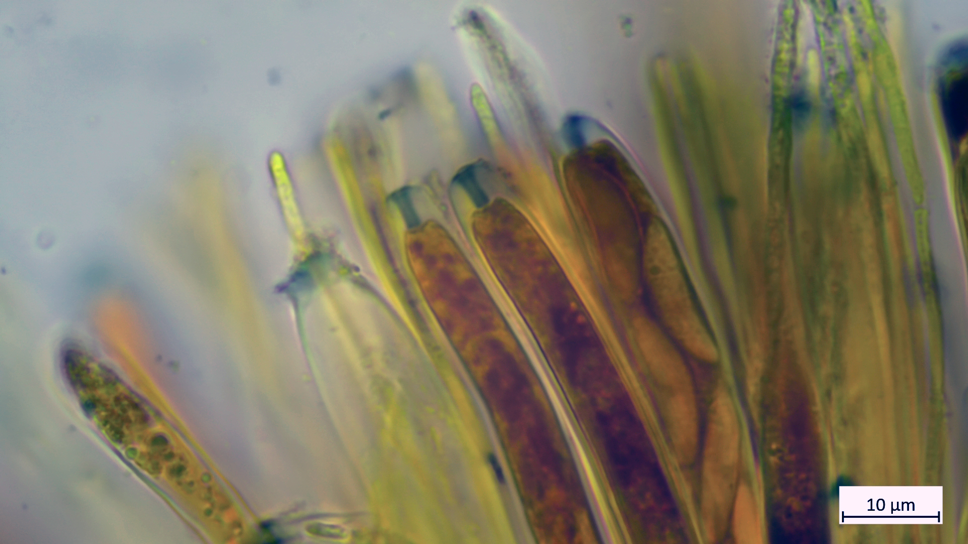 Asci mit amyloidem Apikalapparat, 8 Sporen mehr uniseriat, Sporen mit kräftigen Tropfen: