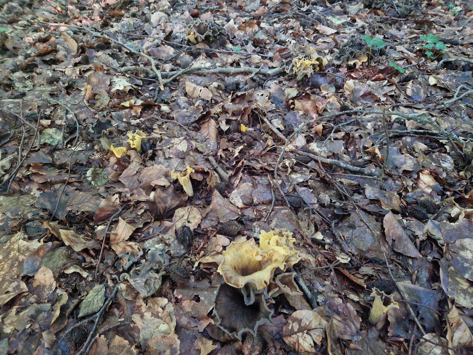 Gestern gab es dann wieder eine Überraschung, mit welcher ich mich ersteinmal auseinandersetzen musste. Ein Areal mit zahlreichen Fruchtkörpern einer Kraterelle, die sich mir aufgrund der Fruchtkörper mit von kräftig gelb, bis schwarz reichenden Fruchtkörpern nicht direkt erschließen wollte. Die schwarzen Fruchtkörper erinnerten schon an die Totentrompete, aber es gab eben auch massiv gelbe und Übergänge. Hier mal ein Überblicksbild (die schwarzen Fruchtkörper muss man suchen, sind extrem gut getarnt):