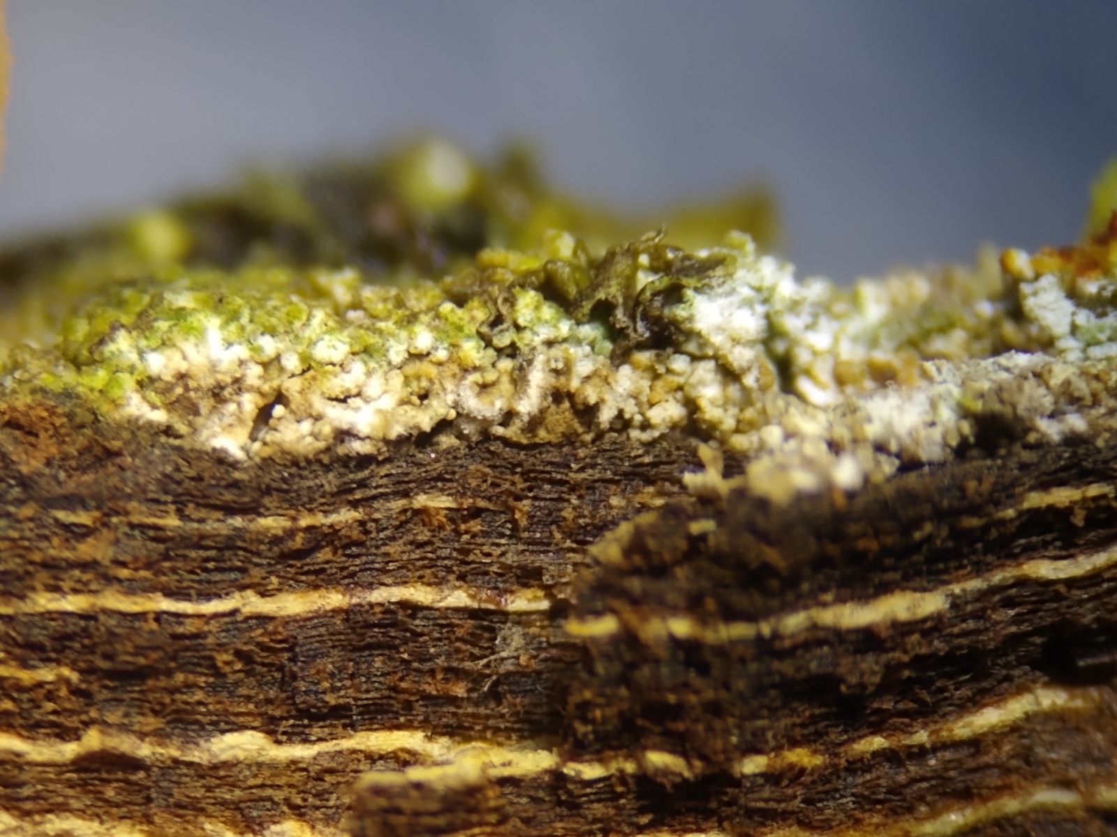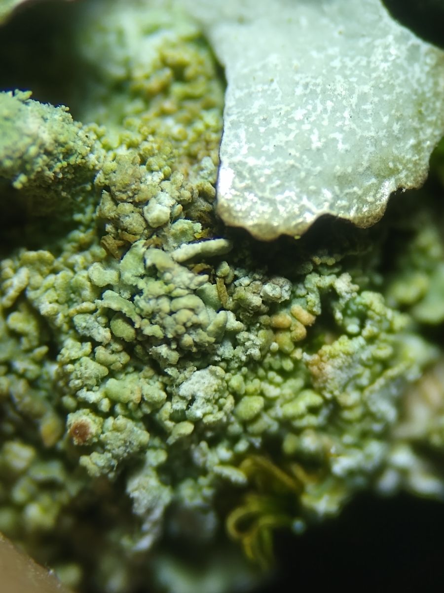 Bild 4 Schuppiger Flechtenthallus zuoberst ocker, tiefer grün, zwischen den Schuppen weiß