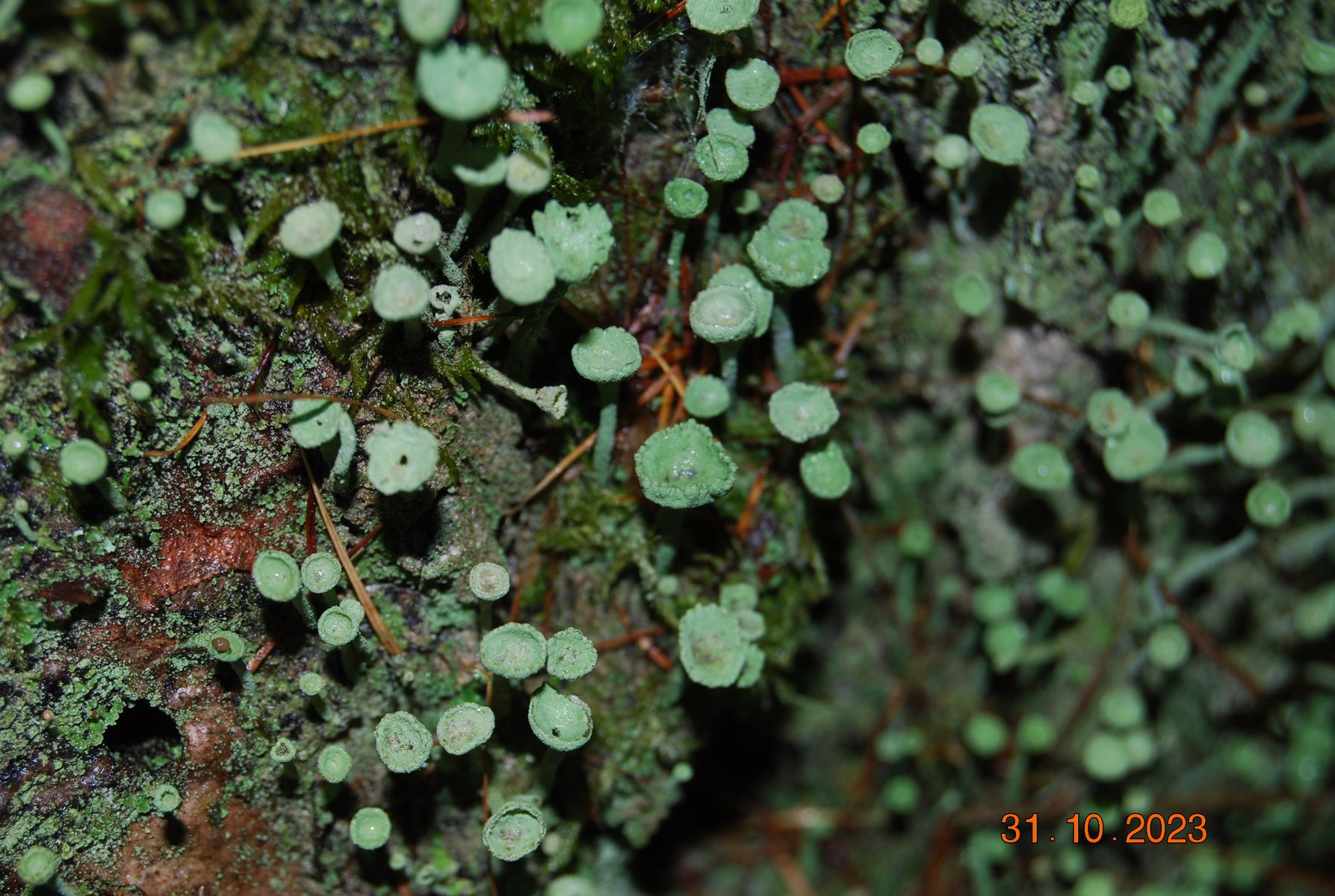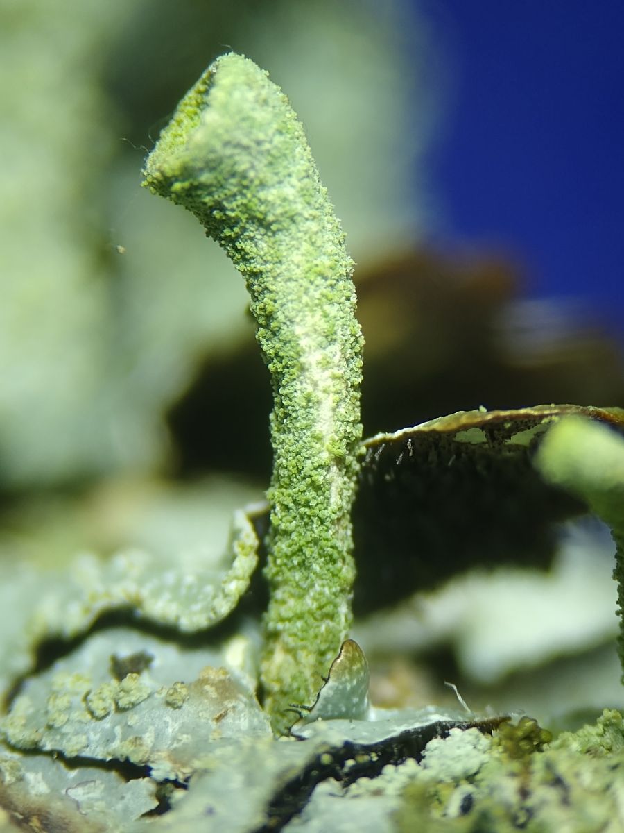 Aber m.E. spricht wirklich so einiges Makroskopische für diese Art (Cladonia fimbriata). Das Podetium ist hohl, die Oberfläche der Fk. ist fein mehlig, die Blättchen sind eindeutig hellgraugrünlich, und die pokal- sowie gleichförmigen Fk. sind wohl auch arttypisch.