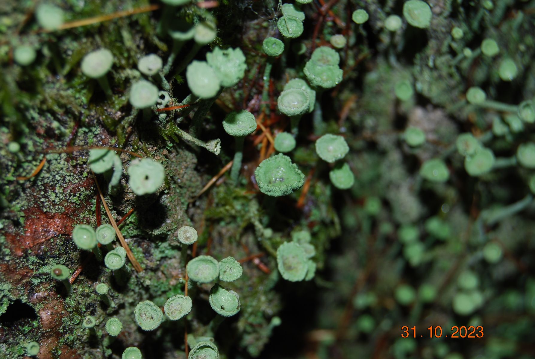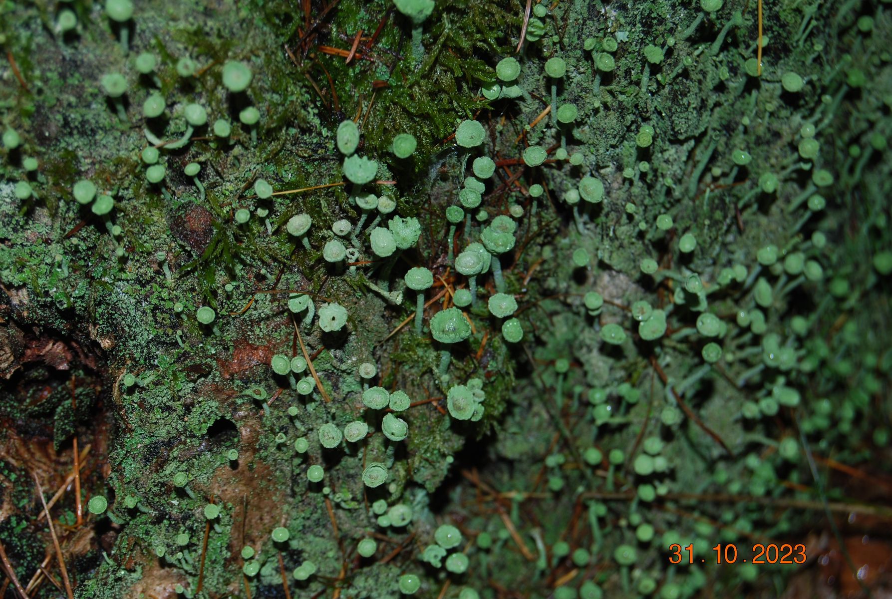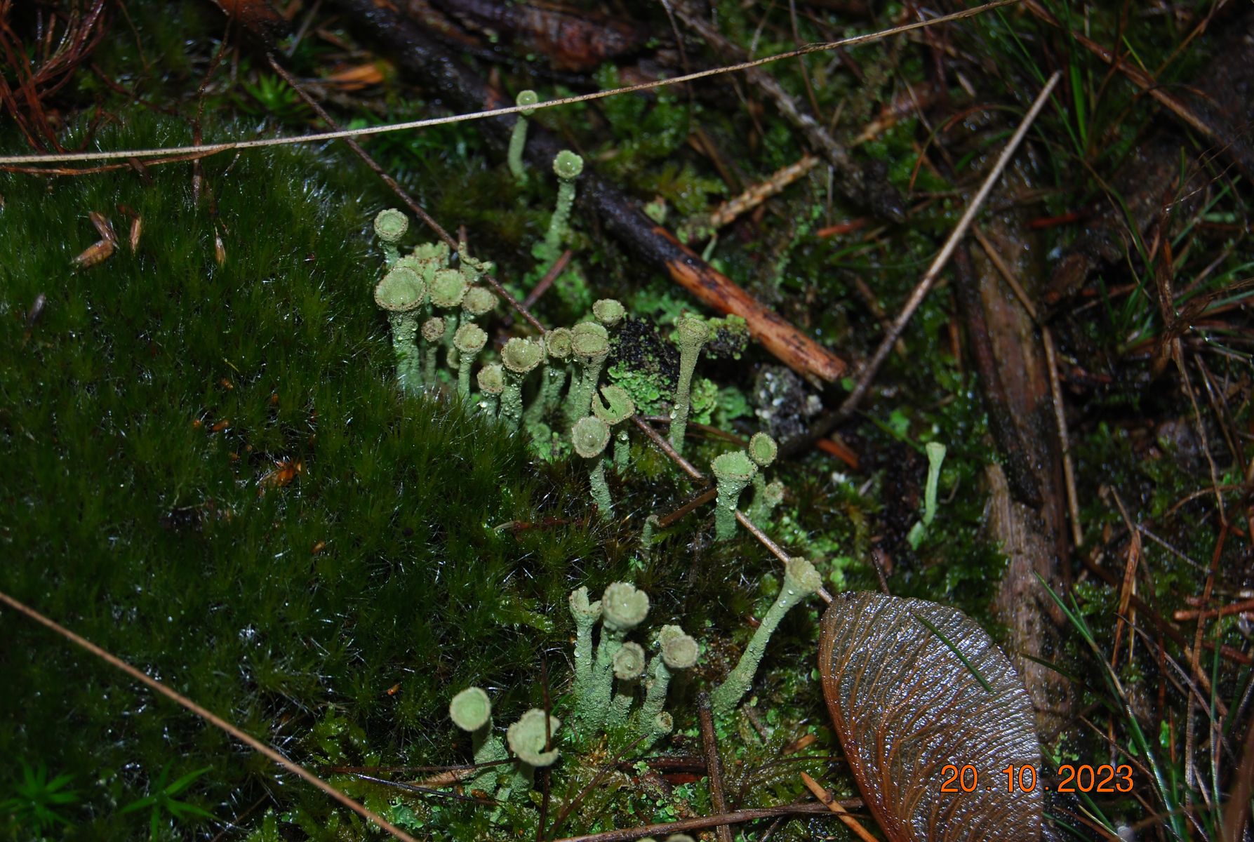 Ich vermute, dass ich da wieder auf die Trompetenflechte Cladonia fimbriata gestoßen bin, was auch schon von der Ökologie u. dem Habitat gut passen würde, denn meinen Erstfund von dieser Flechtenart hatte ich unweit von dort, in einem Schlagflur-Abschnitt.