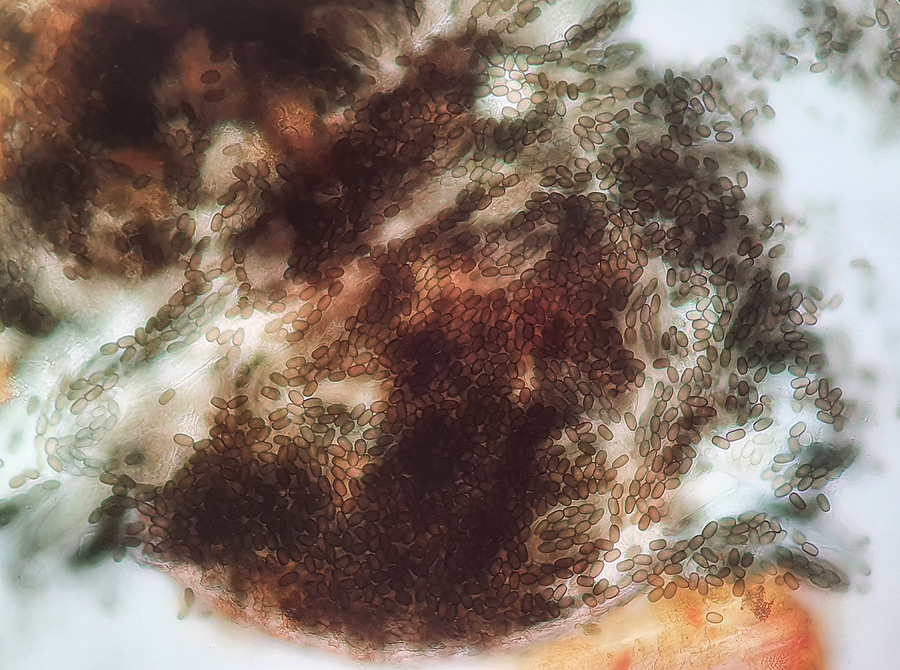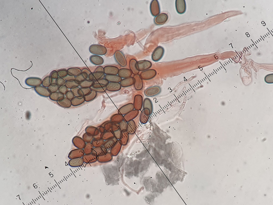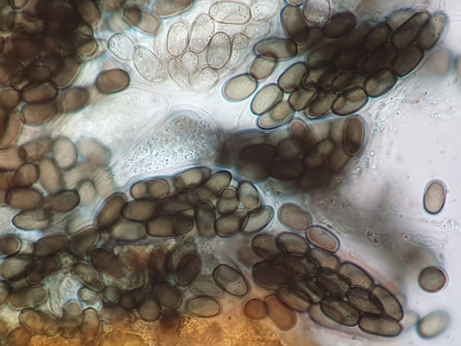 nur eine schwarze Kugel herausgehoben. Drinnen waren viele Hundert Sporenzellen und junge keulige Asci mit vierzelligen Ascosporen. Die reifen Asci waren zum Teil schon aufgelöst. Trotzdem