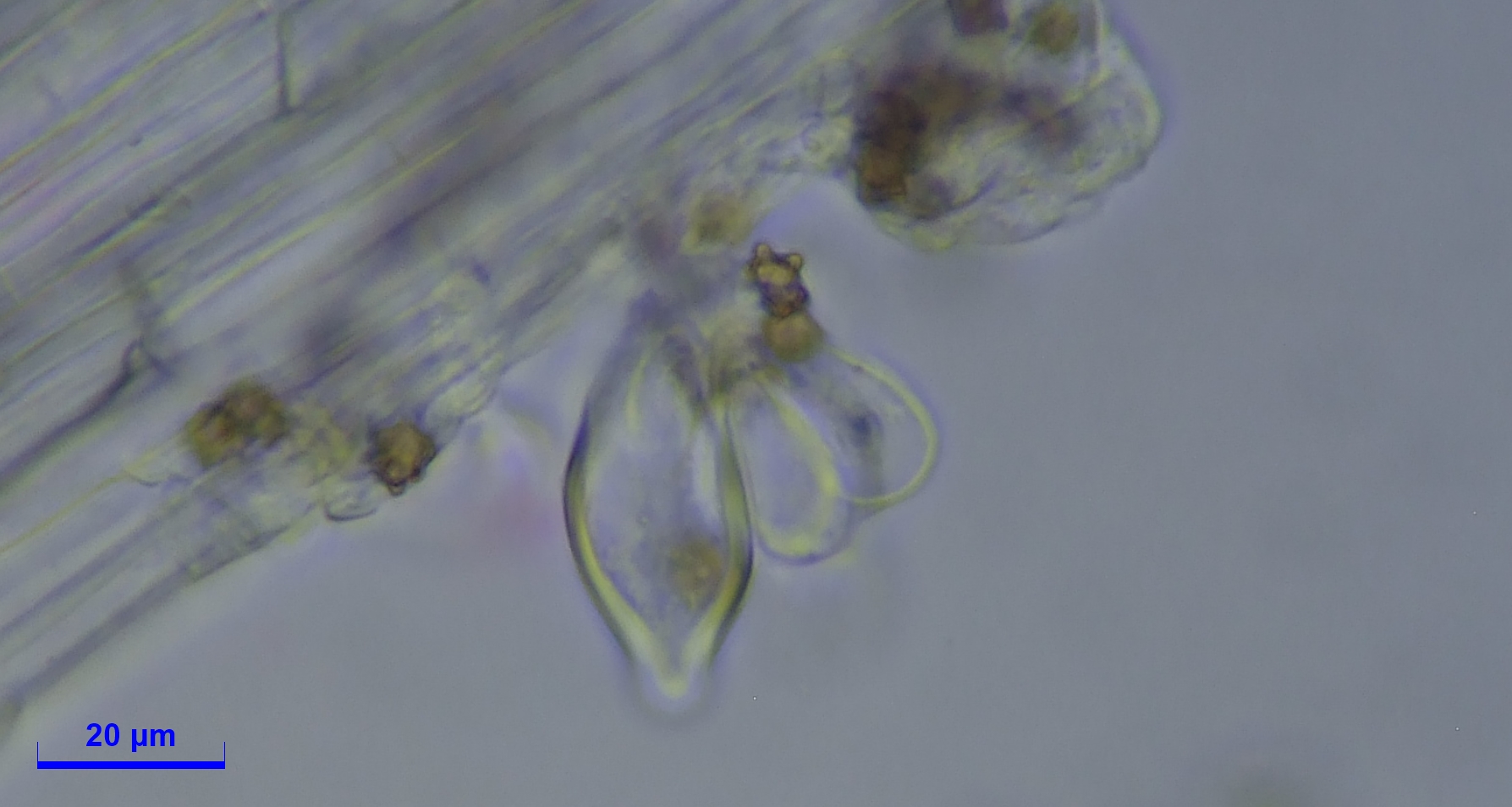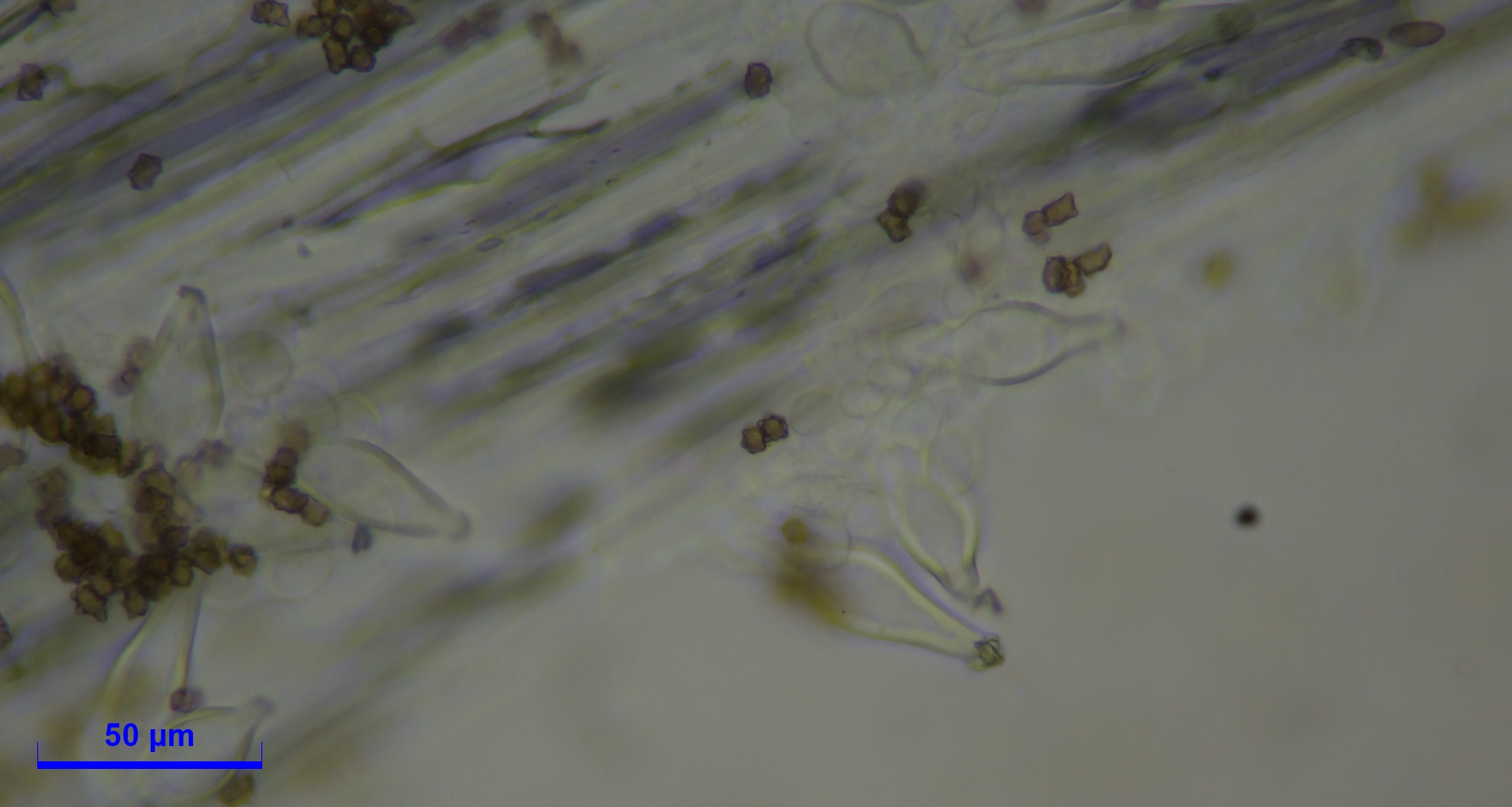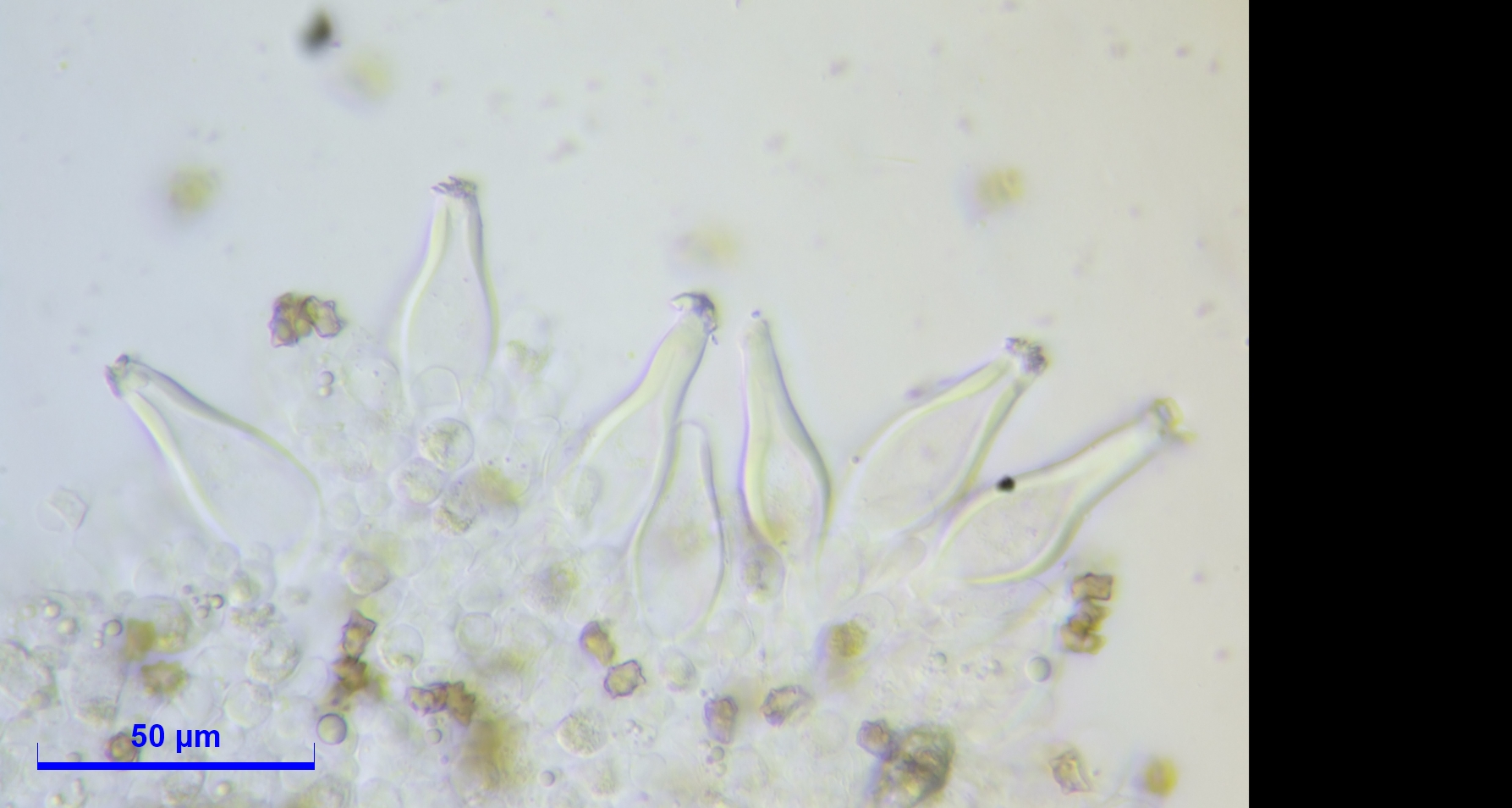 Caulozystiden teils pyriform, bauchig bis fusiform, langeniform, eher flaschenförmig, teils mit Kristallschopf, dann ganz ähnlich den Hymenialzystiden.