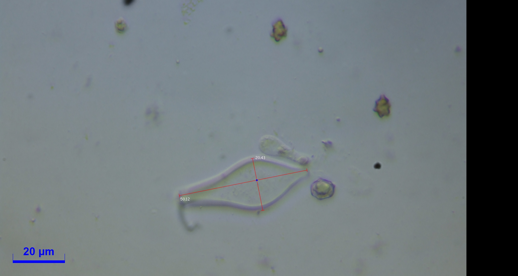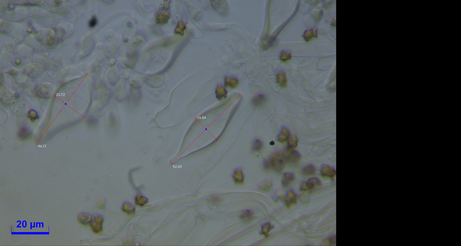 Cheilozystiden und Pleurozystiden vorhanden, metuloid mit Kristallschopf. Wandstärke bis 3,5. Unterschiede in Hymenialzystiden nicht beobachtet. ca. 50x20.