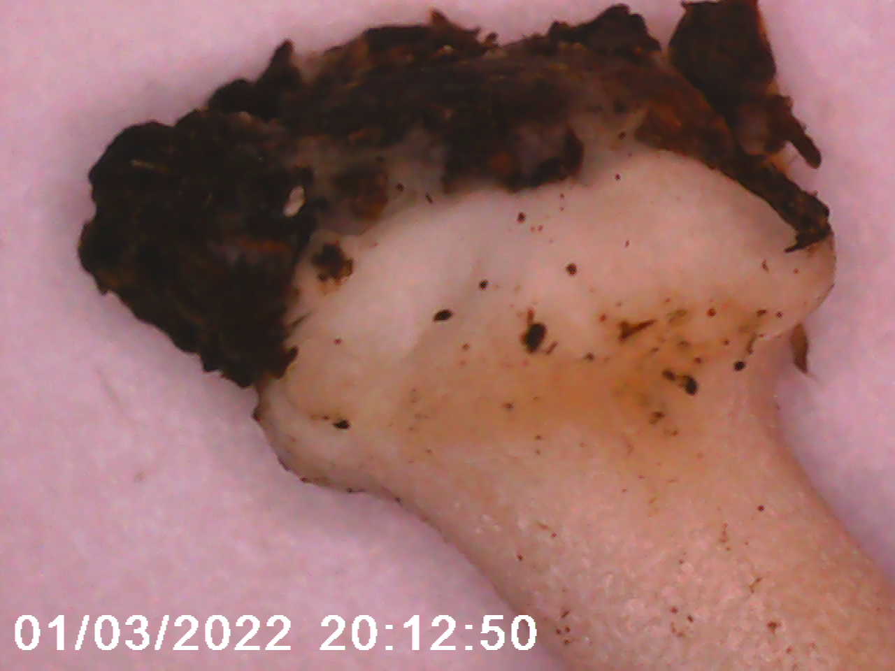 Stiel +- durchgehend weiß, zur Spitze hin mit feiner weißer Bereifung, Basis knollig verdickt. Bis 6cm lang. Trama rötend.