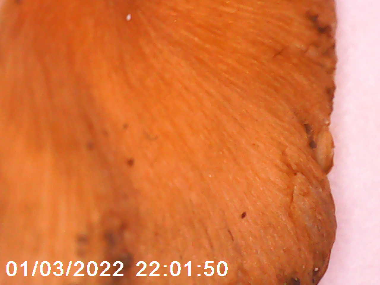 Hut bucklig, Huthaut eine Kutis, relativ glatt mit rimos eingewachsenen Radialfasern, ockerfarben, zur Hutmitte hin gelblicher. Bis 3,5cm breit