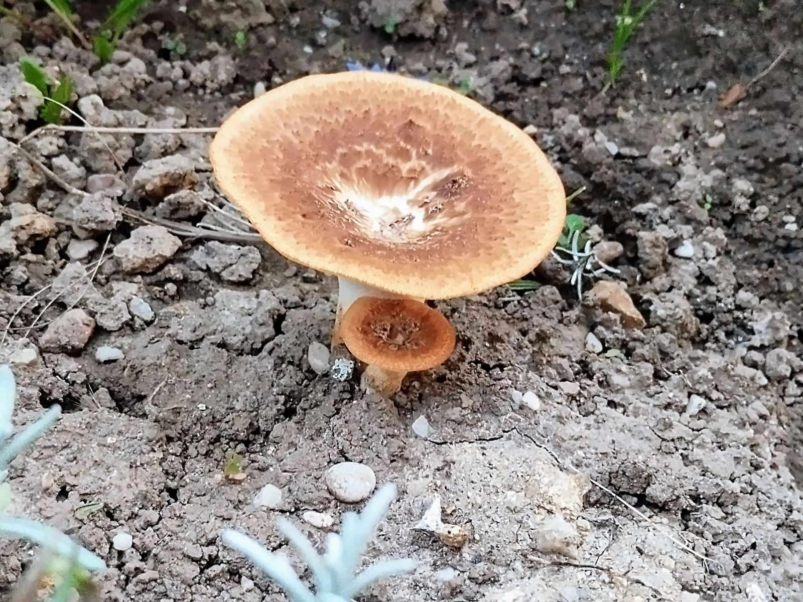 Und nun ist es soweit. Neben Kartoffel, Tomate, Möhre und Zwiebel, genau gesagt zwischen Rosenstock und Lavendel, sprießen jetzt zwei junge Sklerotienporlinge empor.