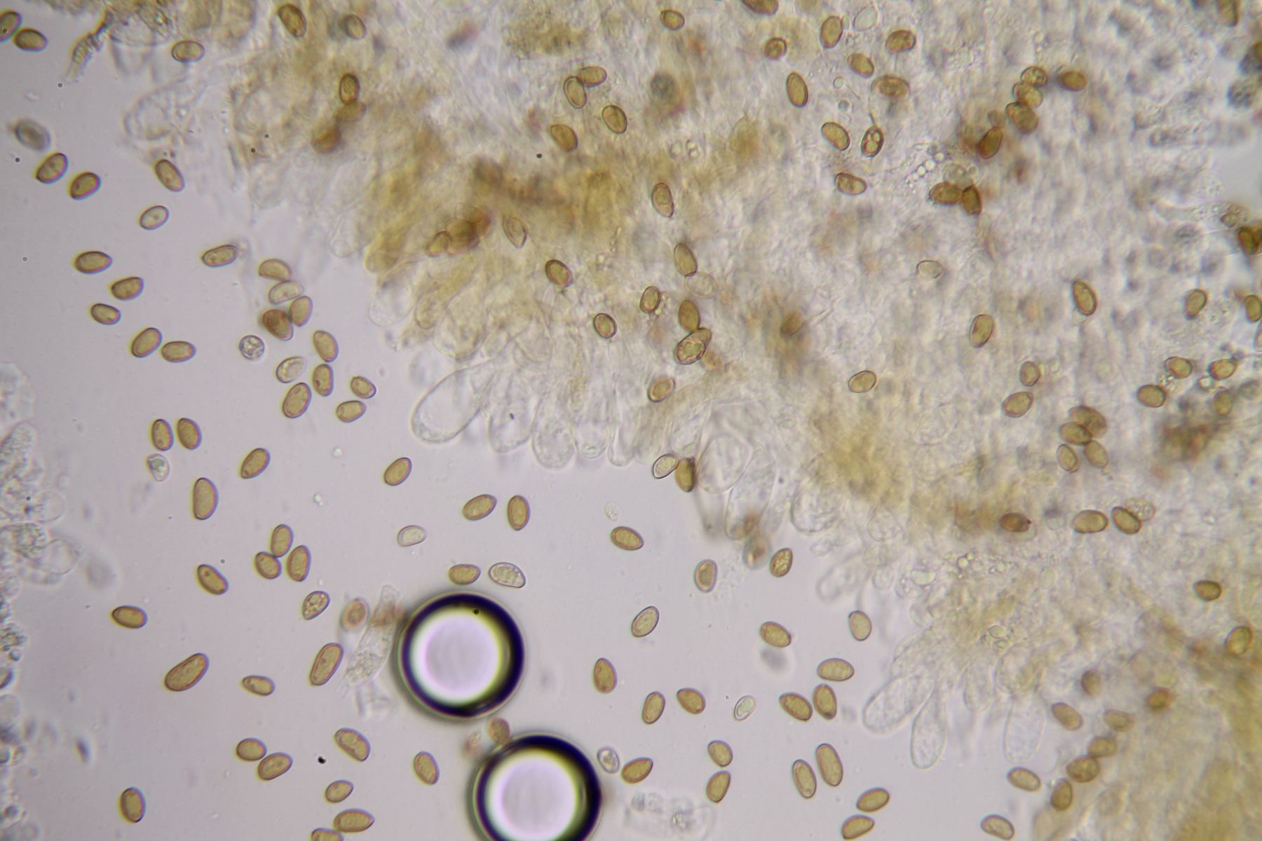 Sporen: bohnenförmig, viele 9-10 x 5 µm; einige "dicke Klopper" waren auch zu sehen mit 12-13 x 7-8 µm. Das schreit nach 2- und 4-sporige Badien; leider habe ich keine 2-sporige Basidien finden können.