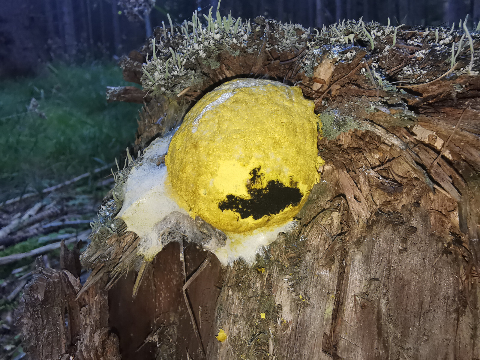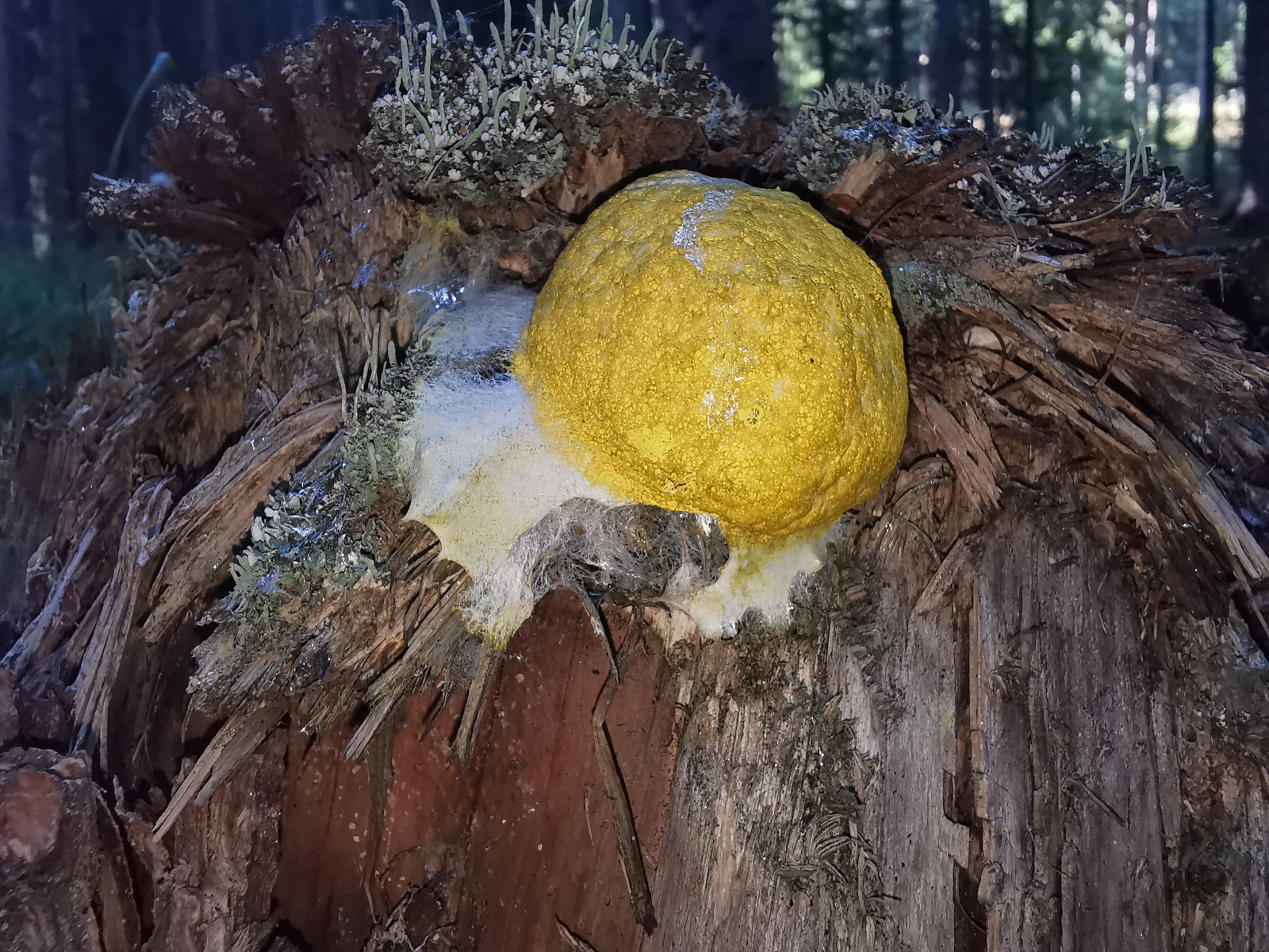 Gelber kugelförmiger Pilz auf Baumstumpf?