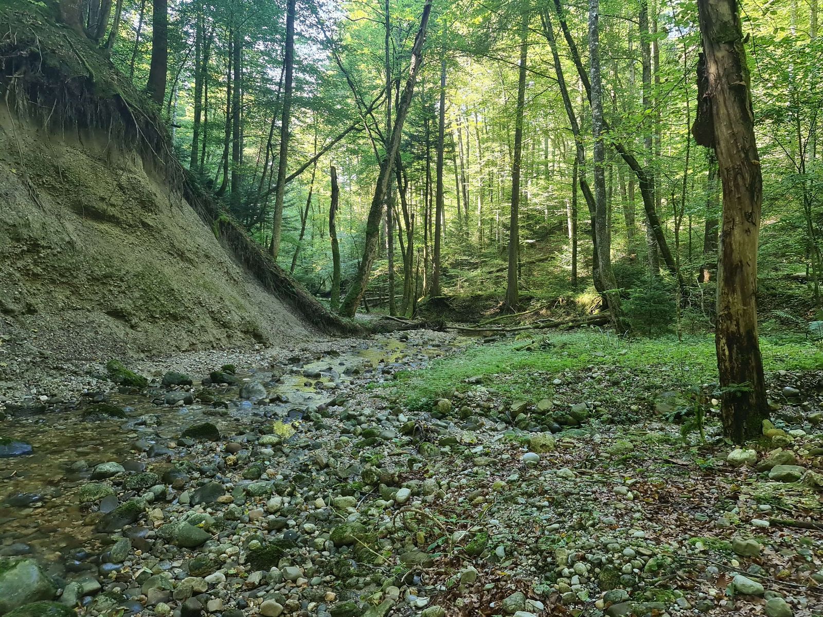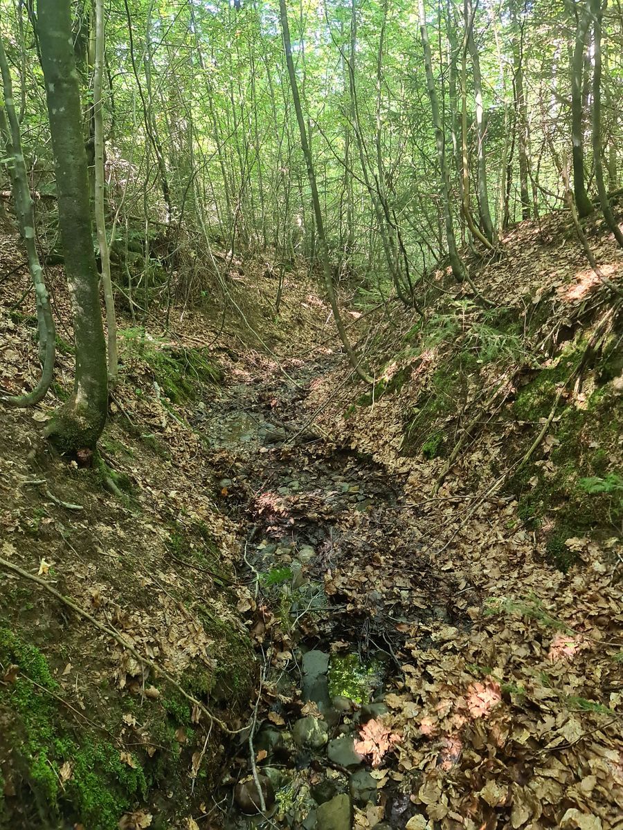 Das Gebiet ist durchzogen von feuchten Gräben und einer hohen Schlucht, in der ein Bächlein fließt.
