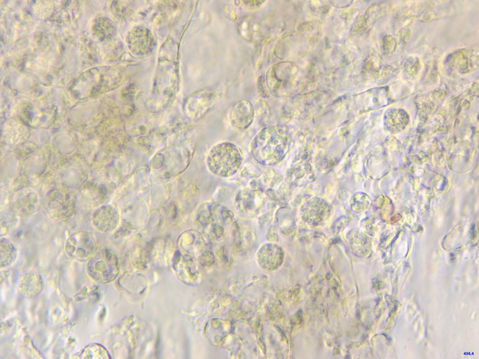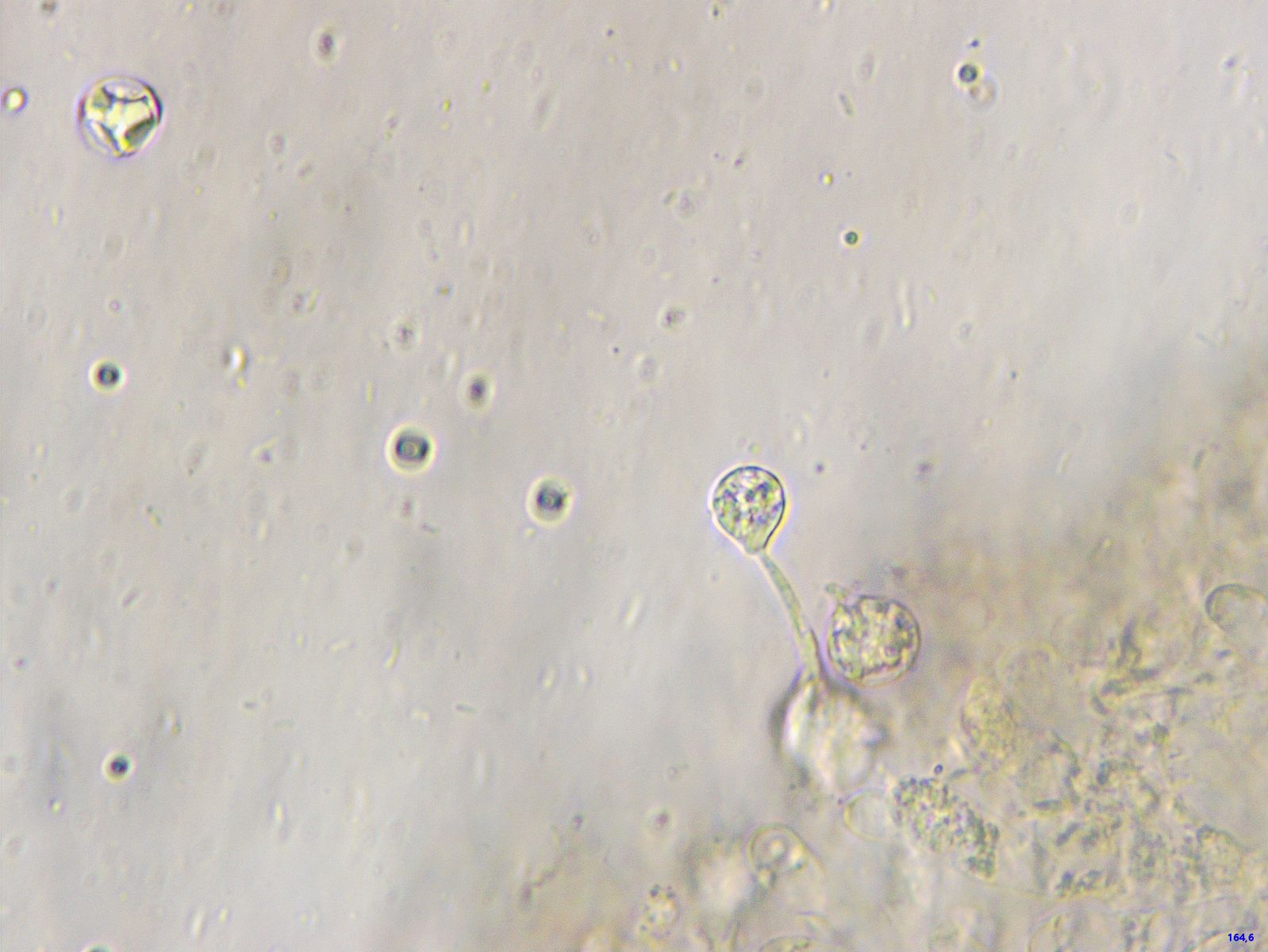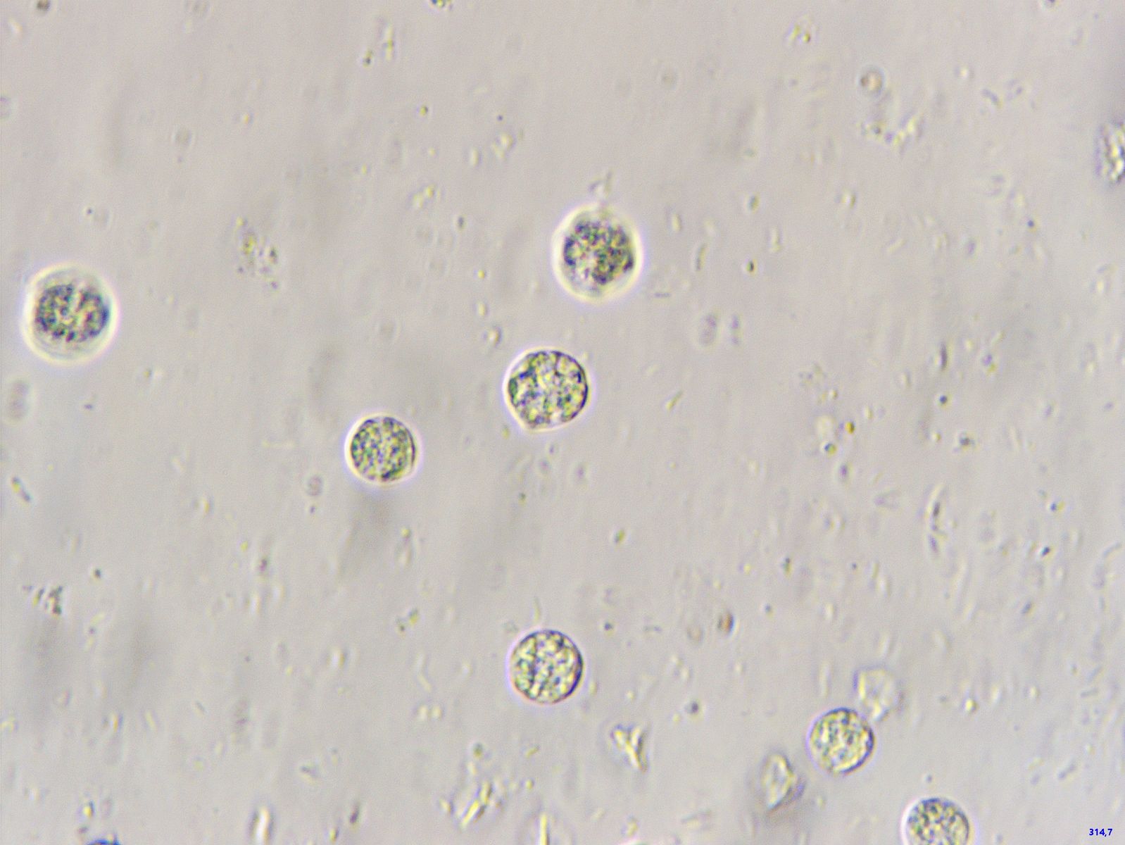 Offenkundig sind diese mit irgendetwas befallen, das diese Sporen produziert. Kugelrund, um 20 Mikrometer Durchmesser.