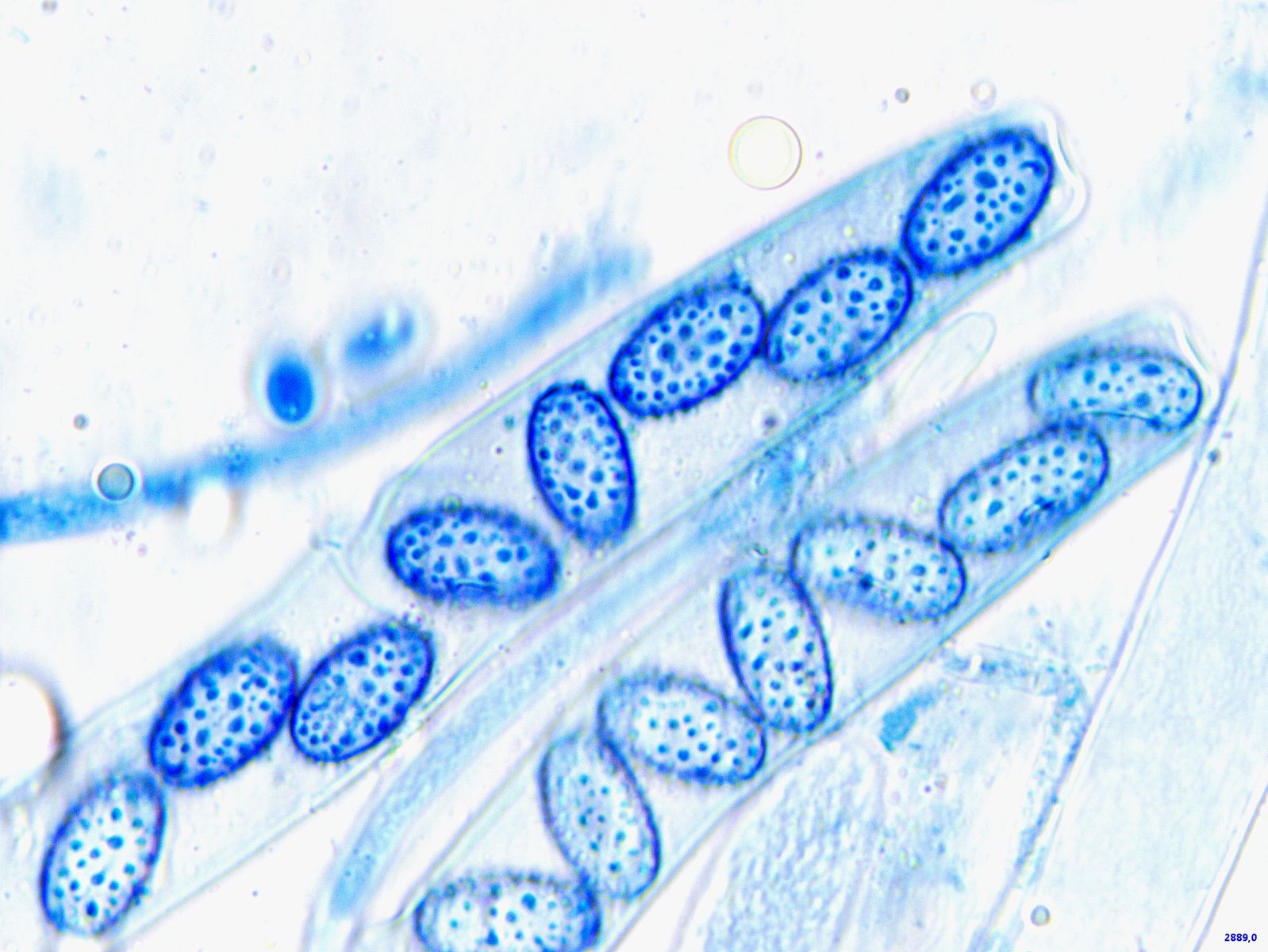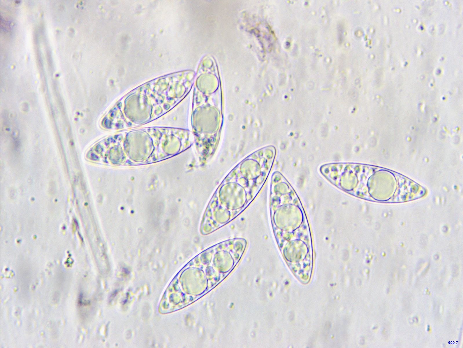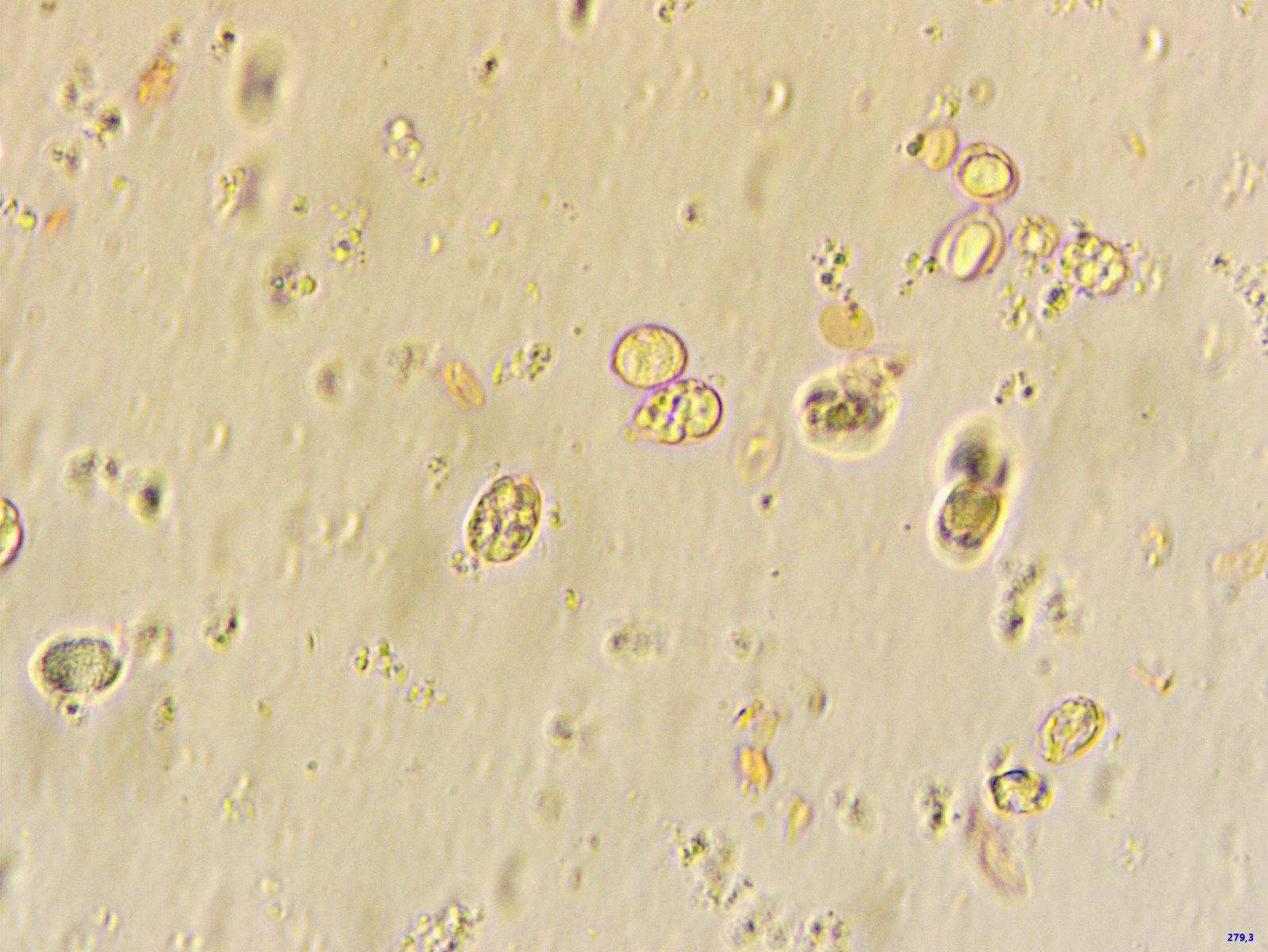 Offenkundig sind diese mit irgendetwas befallen, das diese Sporen produziert. Kugelrund, um 20 Mikrometer Durchmesser.