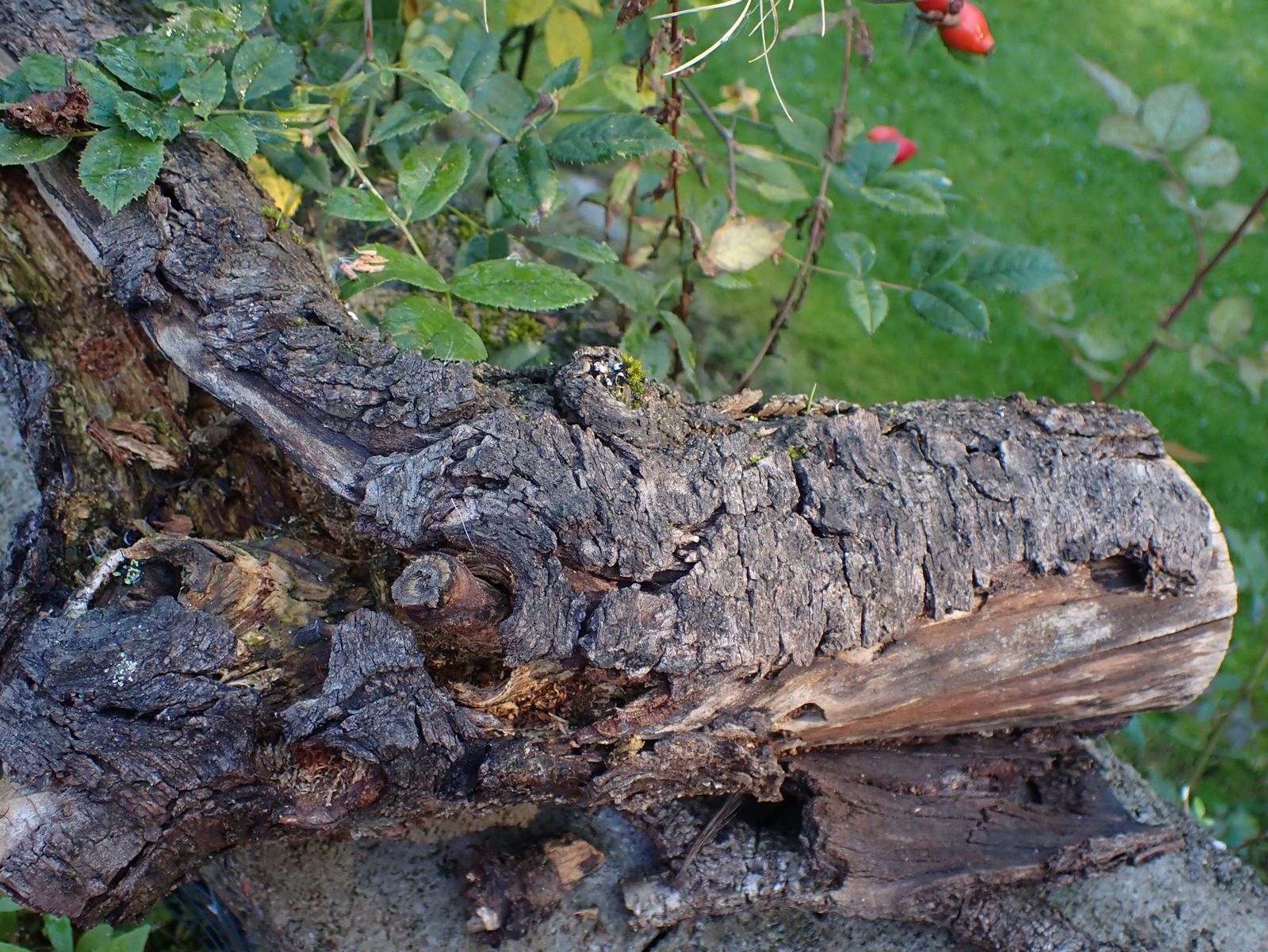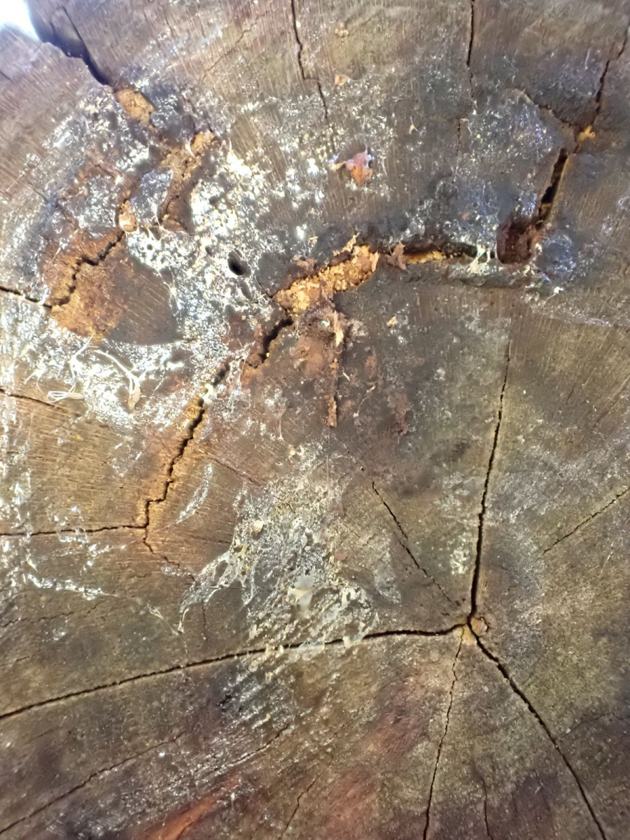 3. Der Ast liegt da schon länger. Dieses Jahr haben sich Hornissen da Material geholt.