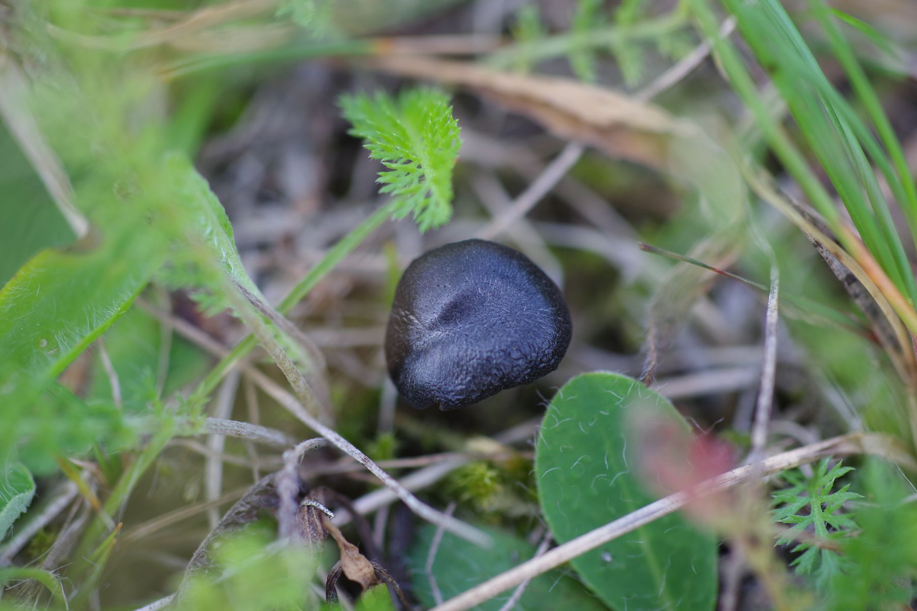 4) schwarz, matt, eingedellt, weiße Lamellen, blaugrauer Stiel