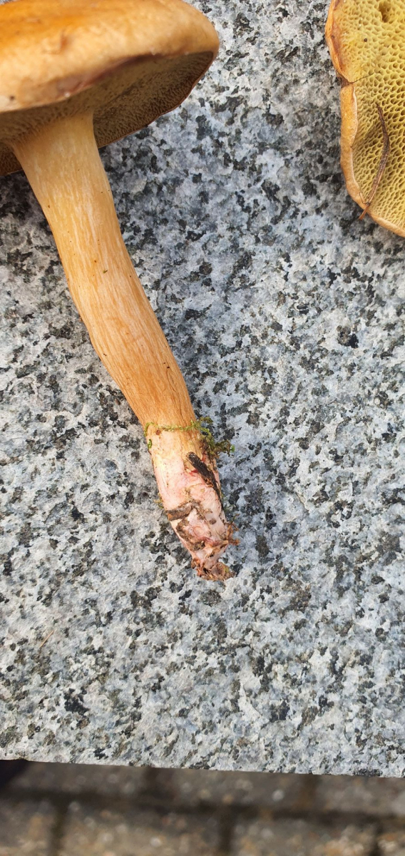 Das Schwämmchen ist eher grobpoorig und anders als auf den Fotos eher gelb-grünlich. Stiel glatt ohne Netz in der gleichen hellbraunen Farbe wie der Hut, an der Wurzel leicht rosa. Das Hütchen glatt und wenn es feucht ist leicht klebrig.