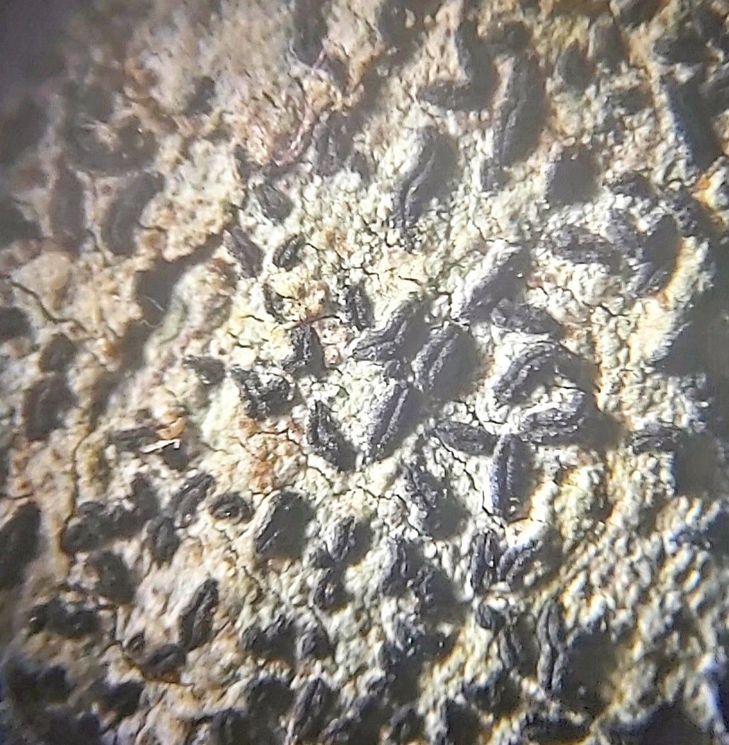 Die Fruchtkörper sind ca. 0,5 is 0,7 mm lang und sitzen anscheinend auf einer Flechte!?