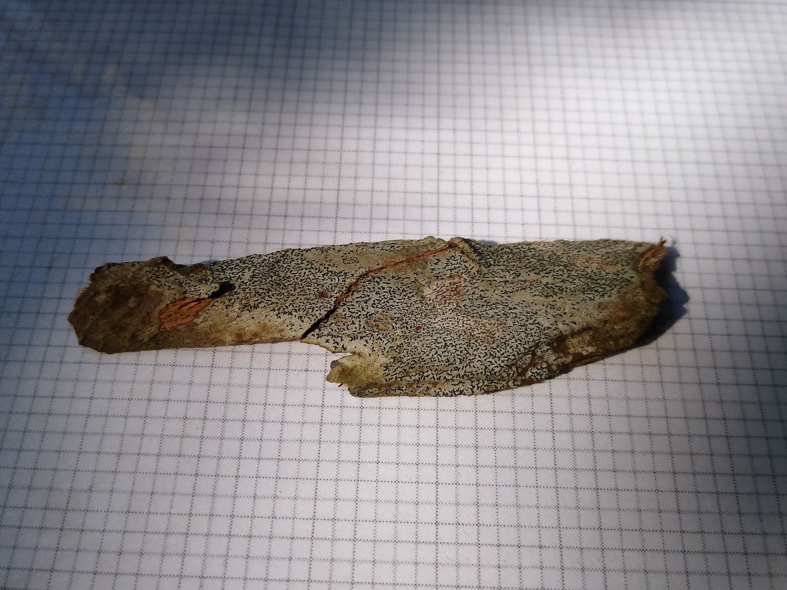Der Fund sieht schon sehr nach einer Flechte mit lirellen-förmigen Fruchtkörpern aus - sprich, die FK gehören aller Wahrscheinlichkeit zum Thallus.