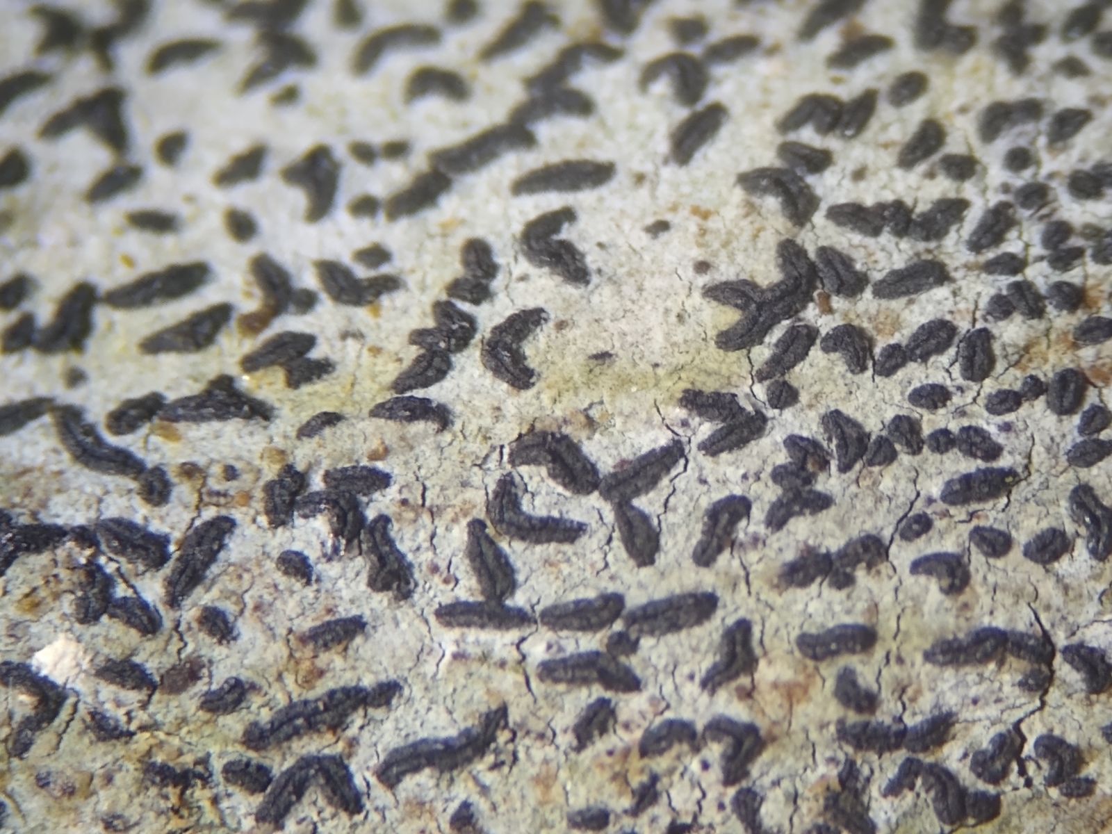 Bild U2 Lirellenförmige Apothecien, teils verzweigt; häufig sich gewinkelt, Spitze an Spitze berührend.