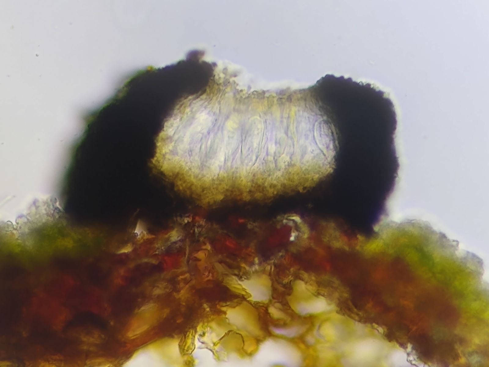 Spätestens jetzt wäre ein vielleicht FK-Querschnitt hilfreich, um zu prüfen, ob das schwarze Excipulum U-förmig unter dem FK hindurchgeht.