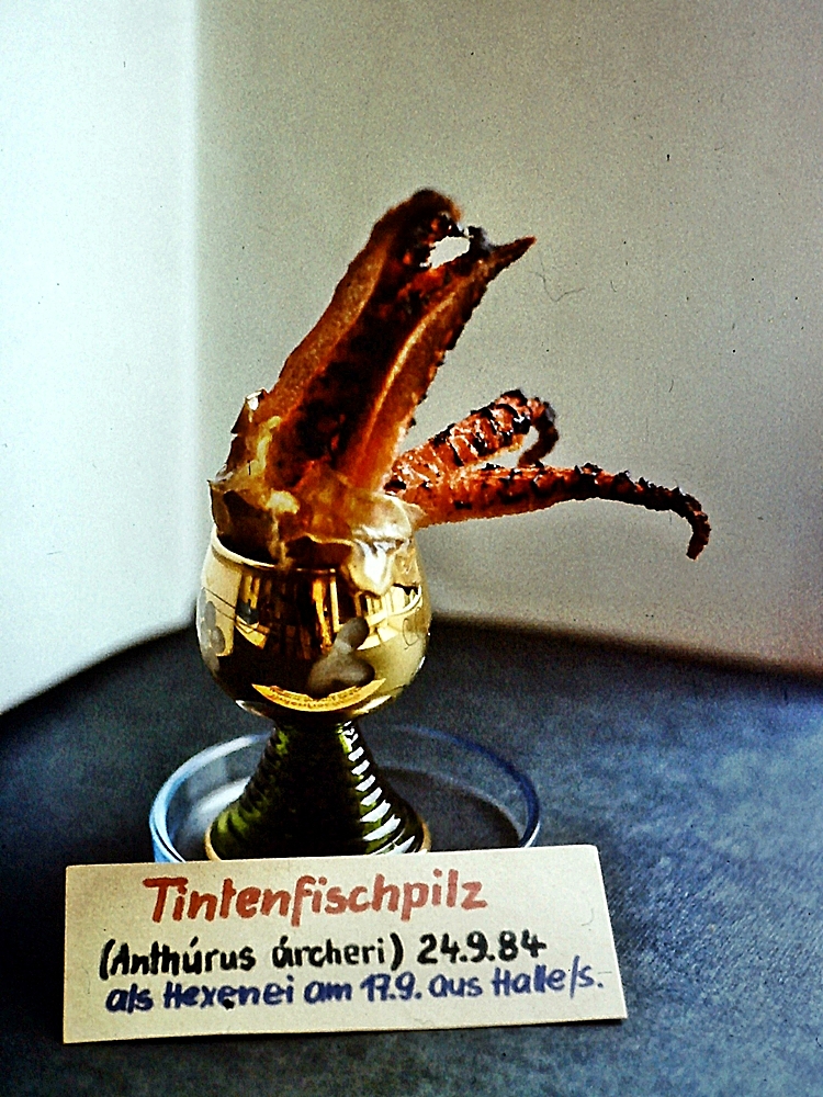 Ja, das sind wirklich schöne Stinker. Ich meine aber gelesen zu haben, dass sie aus Australien eingewandert sind. Ist ja aber nicht so wichtig. Übrigens, falls es jemand noch nicht weiss, kann man das Hexenei von Tintenfischpilzen an den violetten Rhizomorphen erkennen wie man am besten im Bild 3 unten sieht: