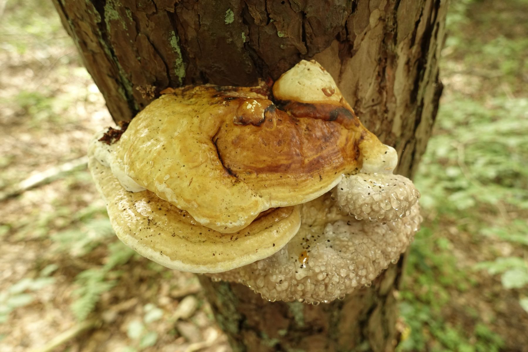 am Sonntag habe ich während einer Radtour an einer stehenden toten Kiefer einen Porling gefunden, den wir zu Viert übereinstimmend als honigartig riechend empfunden haben. Der FK war fest und hart. Teilweise sind an den Fruchtkörpern zahlreiche Glutationstropfen vorhanden, wie aus den Fotos ersichtlich. Ein Schnittbild habe ich nicht gemacht. Nach längerem Suchen bin ich beim Rotrandigen Baumschwamm oder Fichten-Porling - Fomitopsis pinicola - angelangt, obwohl er nicht das mir als typisch bekannte Aussehen hat.