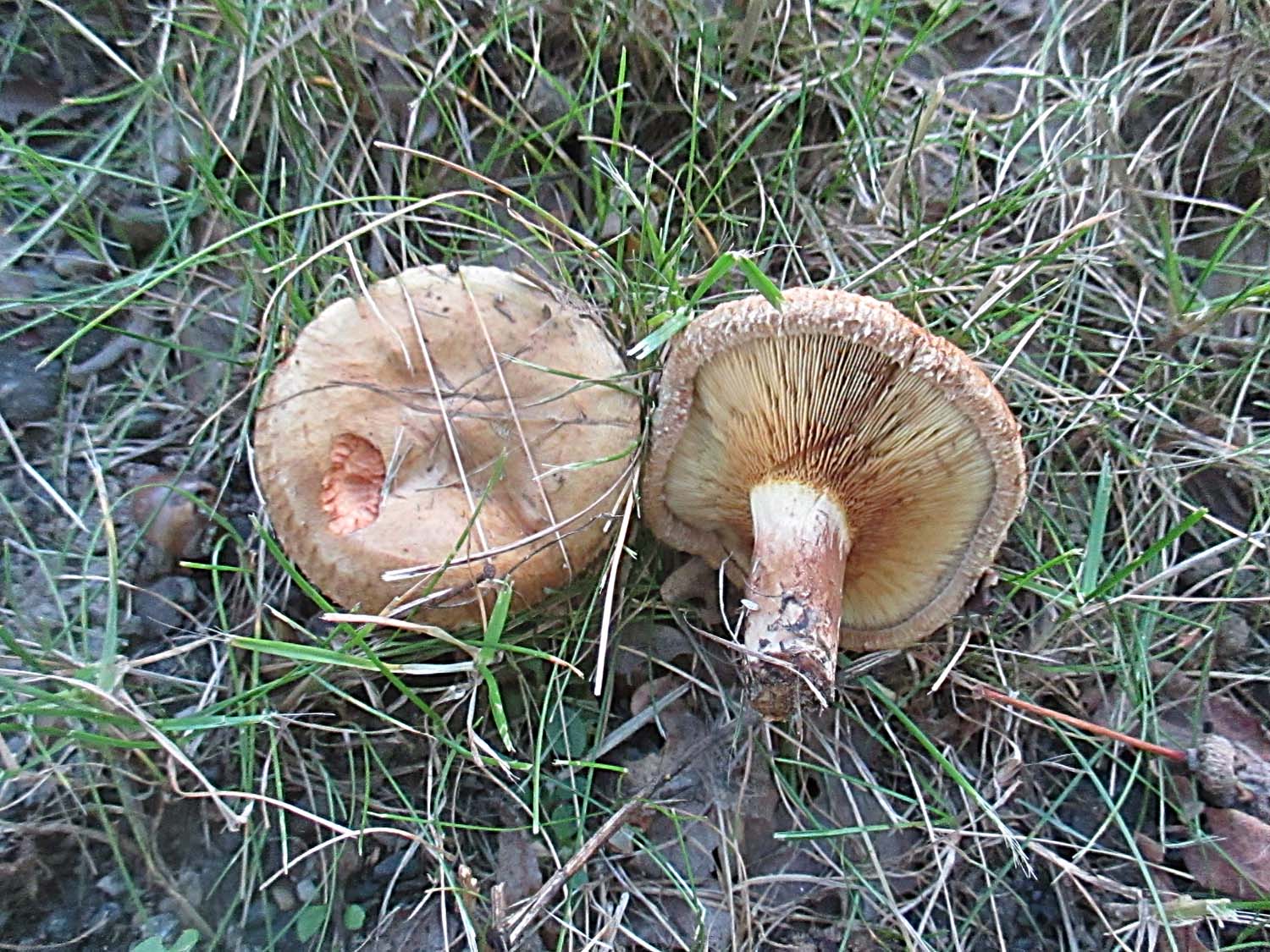 Unter einer einsamen Kiefer haben sich zwei Körnchenröhrlinge (Suillus granulatus) hervorgetraut.