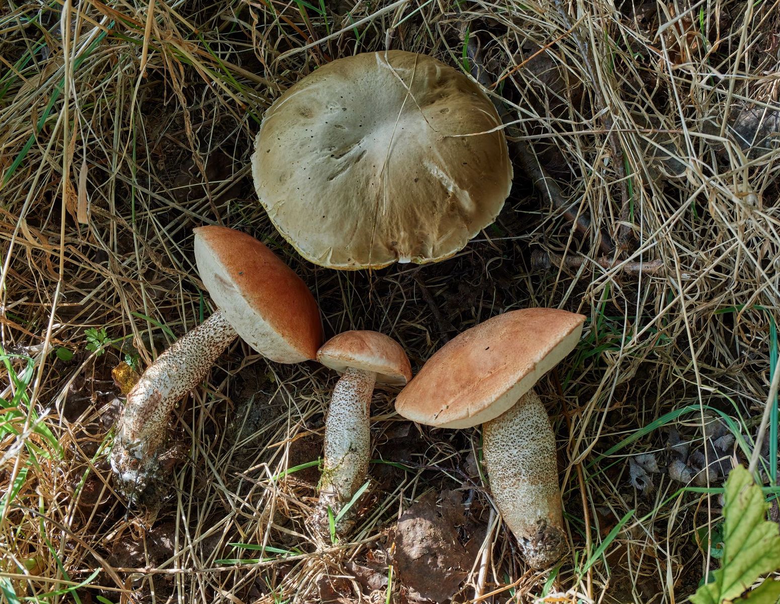 Nachdem die Morgensonne etwas gestiegen war begab ich mich zu einem Kreuzotterhabitat, um mal nach den Aktivitäten zu sehen. Im Gegensatz zum Heimatort war es im Westerzgebirge kühler und dies hatte dort in der Nacht zum Tau-Ausfall geführt. Deshalb erschien es ungeplant lohnenswert, nach Pilzen zu suchen, obwohl schon 2 Wochen kein Regen fiel. Vor Ort waren reichlich Espen und Birken. In einem Espengehölz waren in der Nacht frische Espen-Rotkappen gewachsen, die neben einem überalterten Steinpilz standen (Foto1). An einer Waldrandstelle mit Espen, aber ca. 30cm auf Ackerboden mit einer Weidelgras-Rotkleekultur fand ich erneut Raufüße, die ich für Lecc. duriusculum halte (Fotos 2-4). Drei Wochen zuvor hatte ich an der gleichen Stelle den Verdacht auf diese Art, denn das einzige verkrüppelte Exemplar grünte an der Stielbasis. Schließlich standen noch paar dürftige, 1-2 Tage ältere Birkenpilze herum. Habe mal die 3 Artfunde nebeneinander fotografiert (Foto 5, Birkenpilz linkes Ex.).