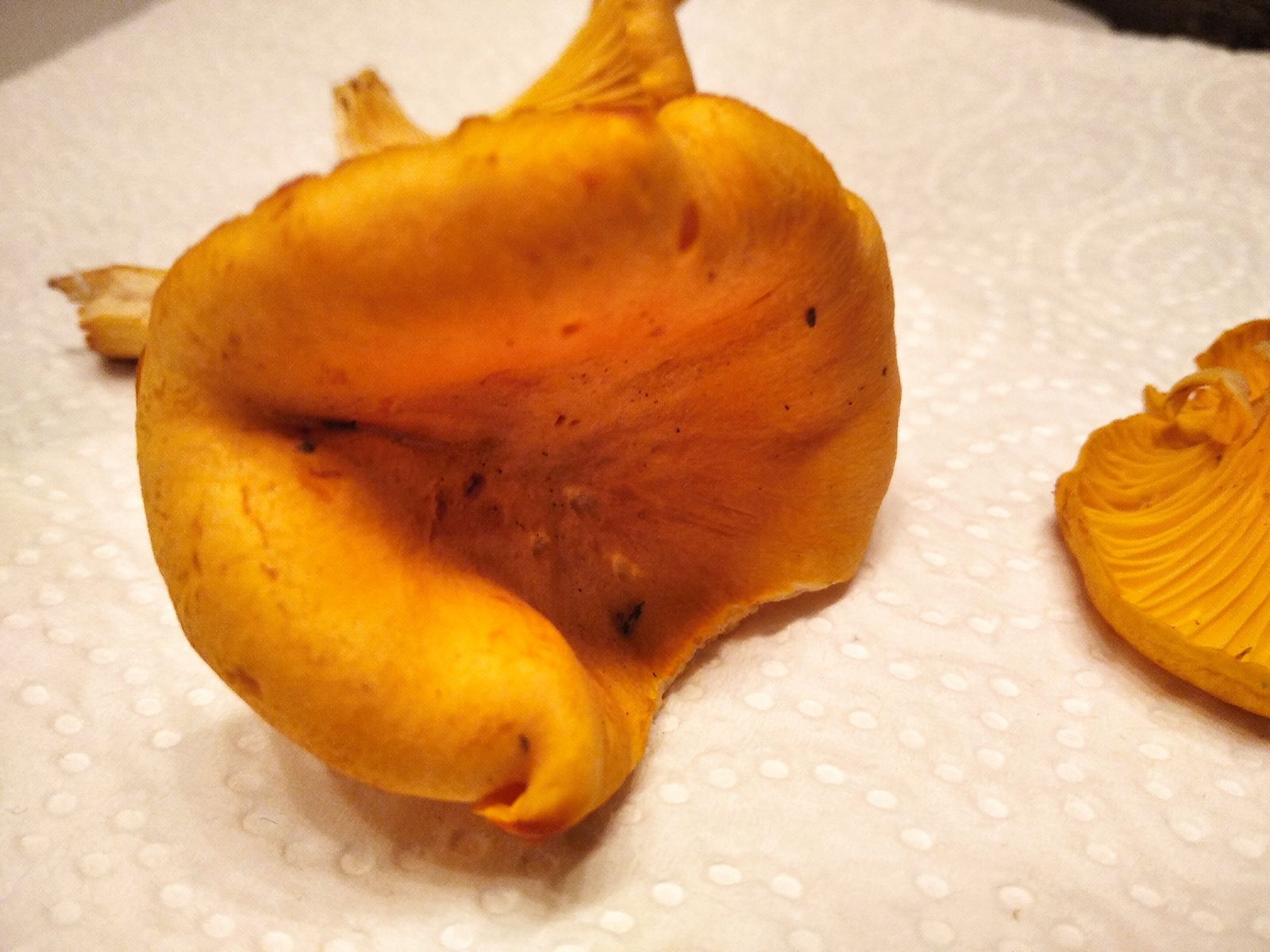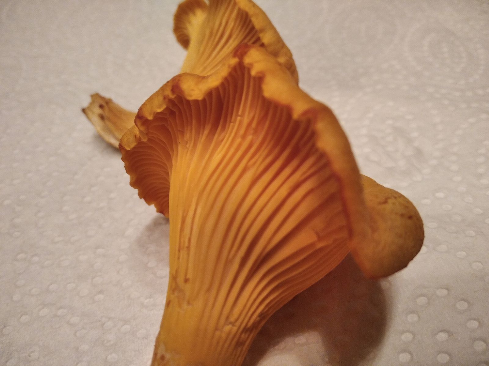Außer eben diese drei Pfifferlinge. Jetzt komme ich aber auch ins Grübeln. Sind das Echte- oder Aprikosenpfifferlinge?