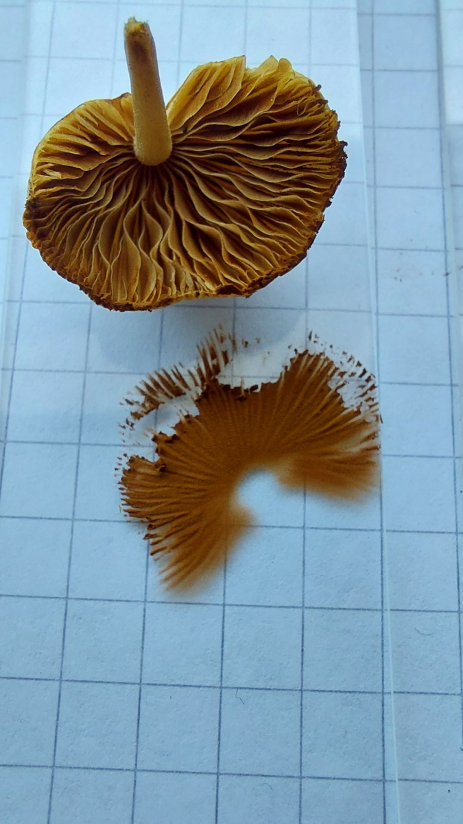 Lamellen sind schmal angeheftet, Farbe wie der Hut. SPP rostbraun. Mit Zwischenlamellen, Schneide gesägt.