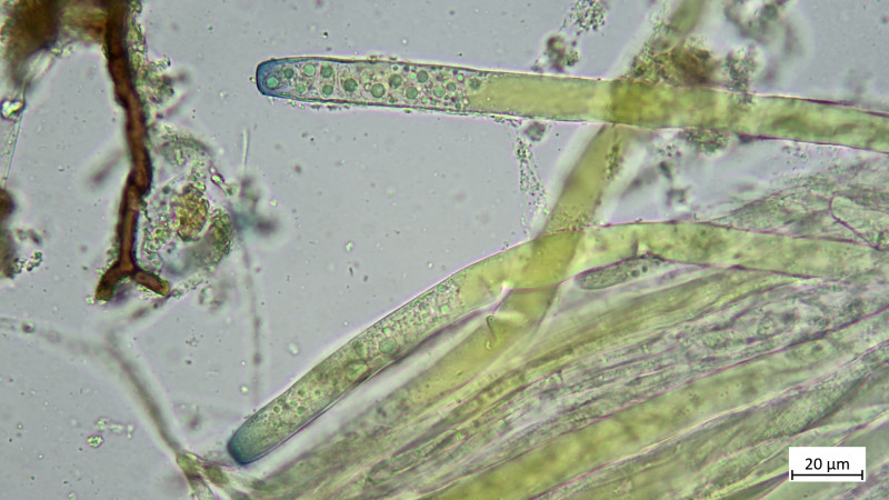 Asci operculat, apikal amyloid, Sporen nicht frei, unreif (Ornament nur schwer zu erkennen), mit zwei Öltropfen: