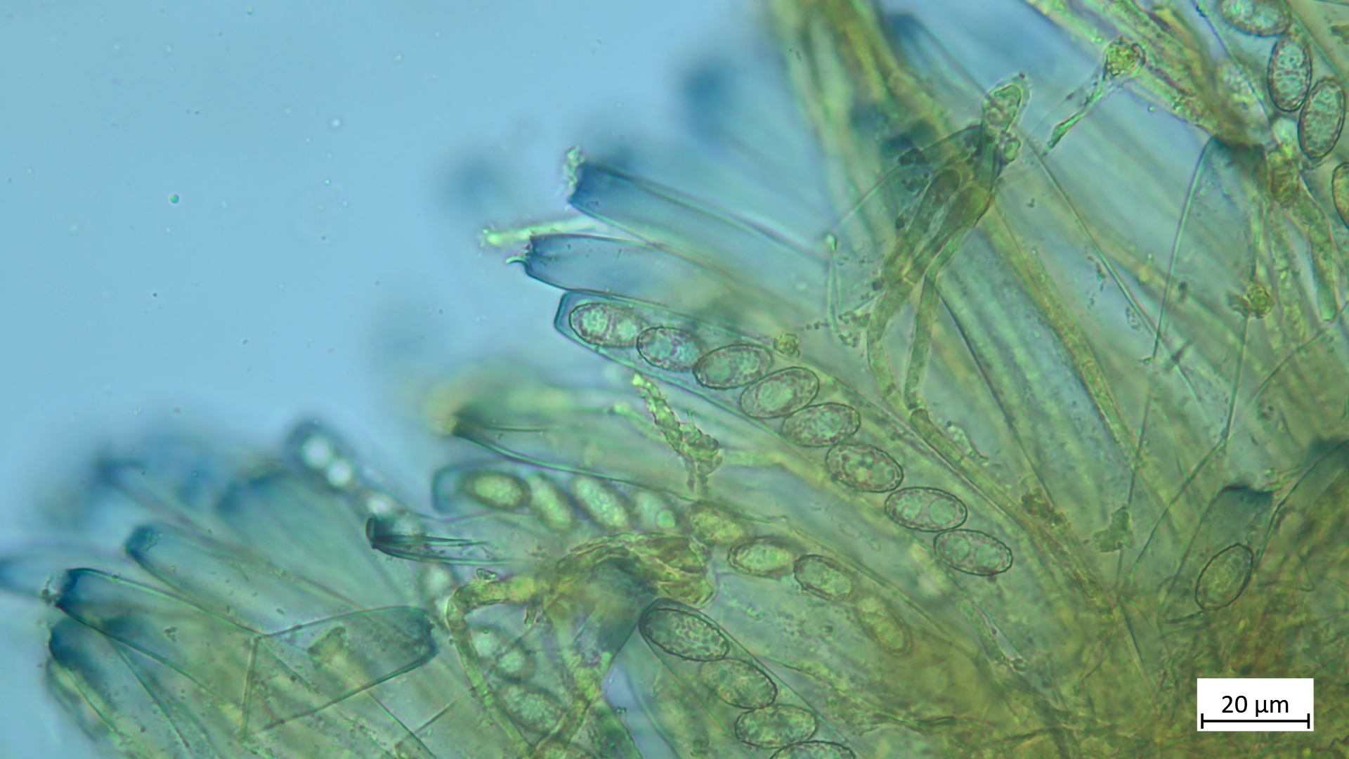 Hier gemeinsam mit den ellipsoiden Sporen der Humaria