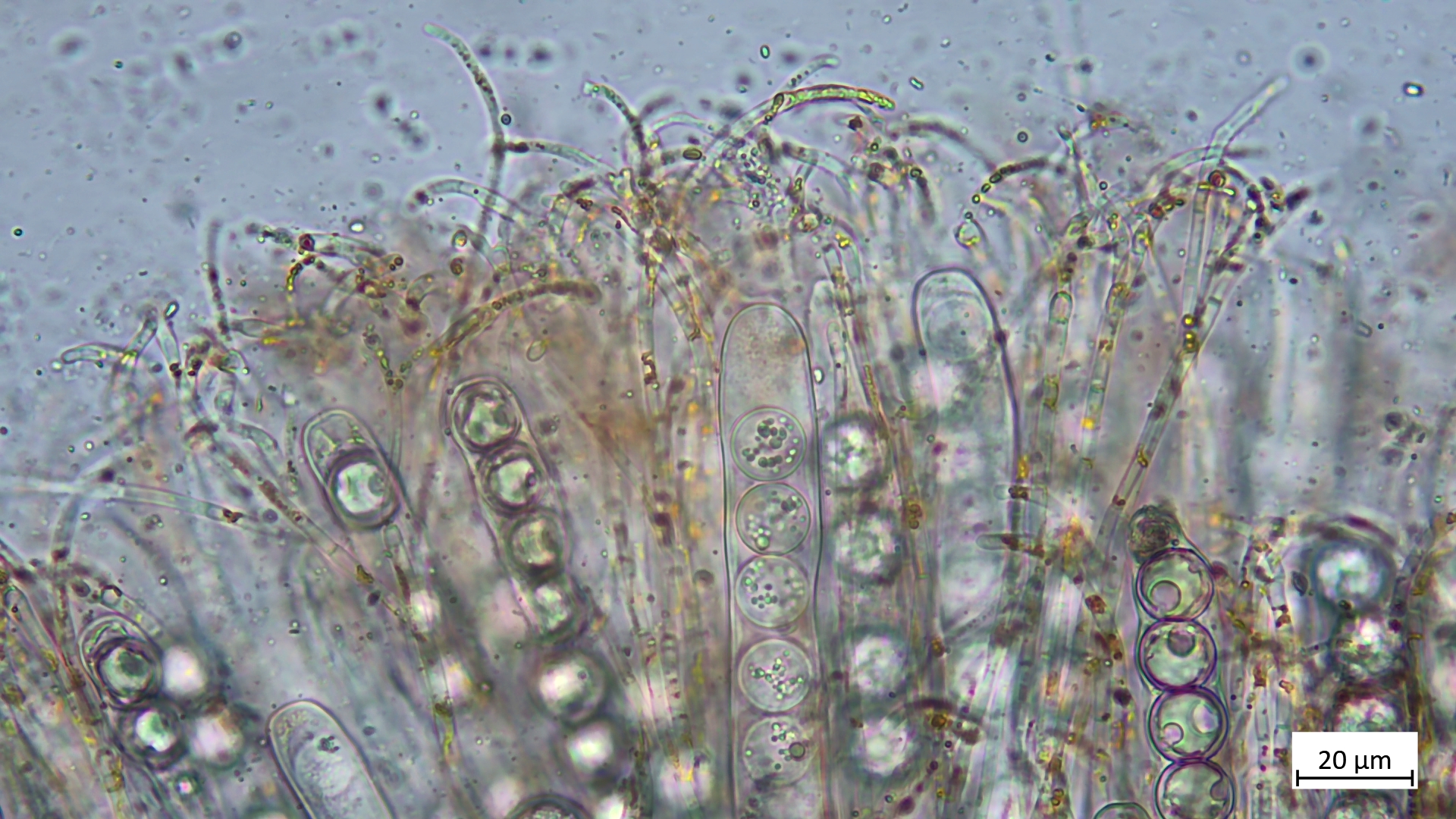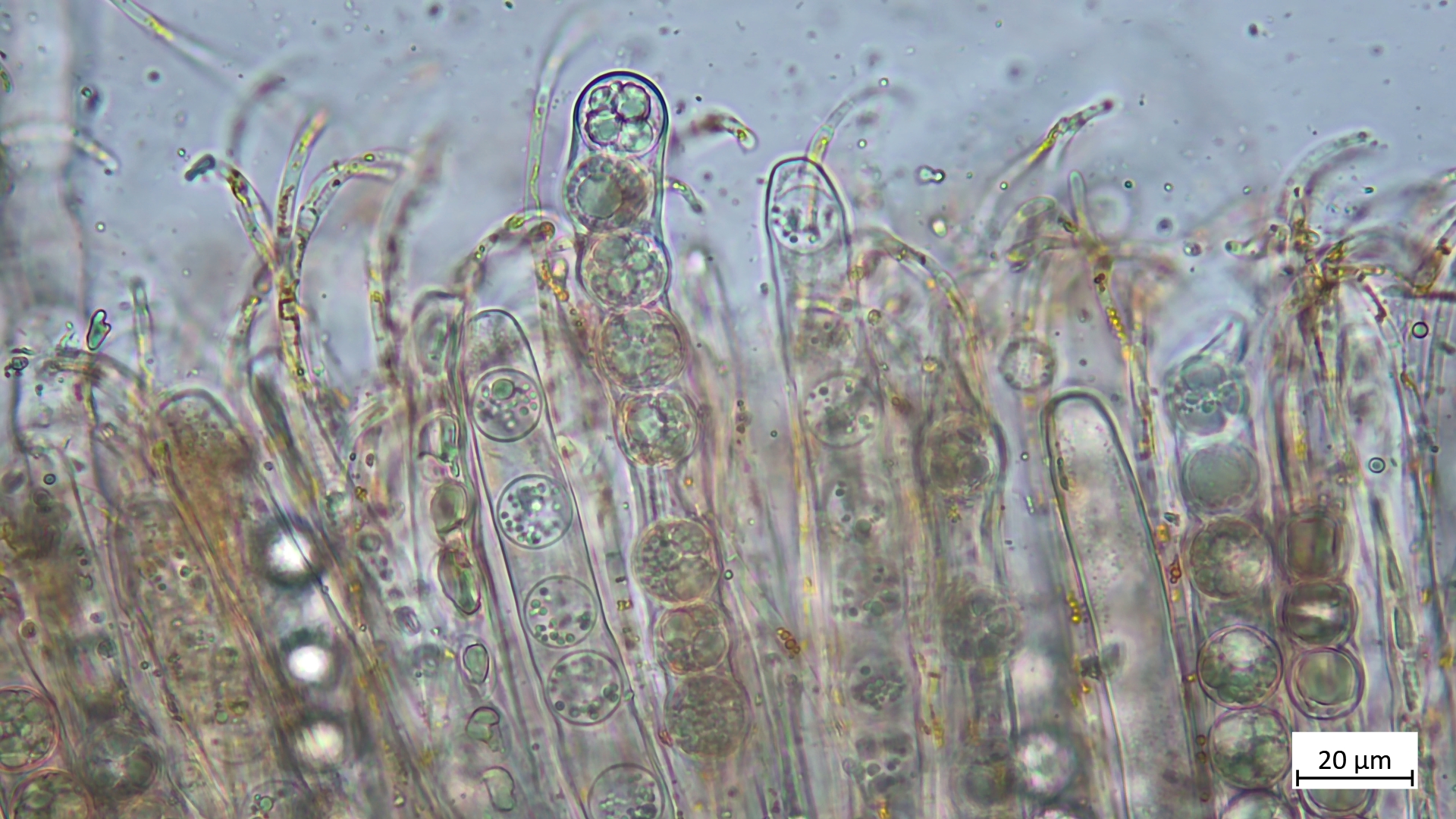 Paraphysen mehrfach septiert, eine besondere Granulation konnte ich nicht feststellen auch keine grünverfärbende in KOH3% oder ähnliches: