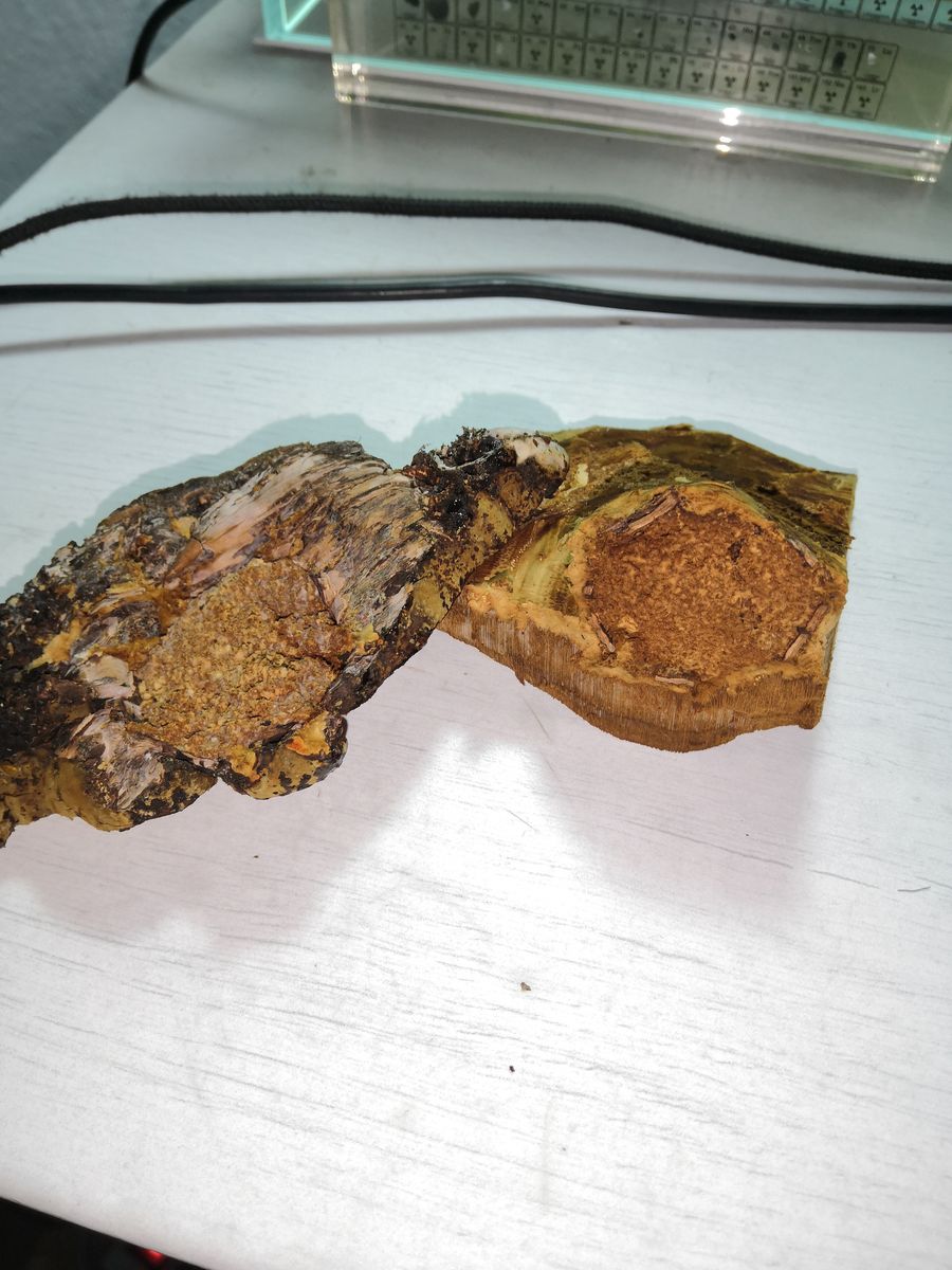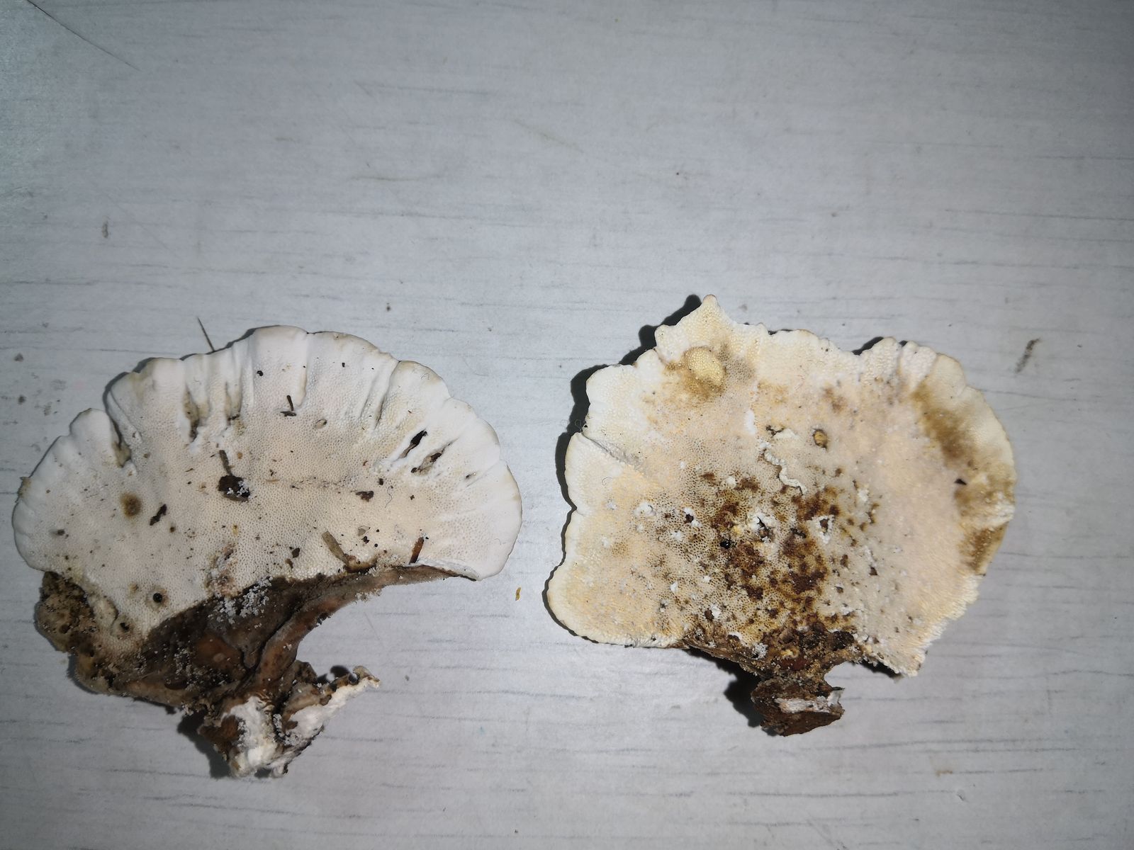 Diesen Pilz habe ich als G. adspersum bestimmt. Bei den weißen Stellen an den Schnittflächen handelt es sich um nachträglich gewachsenes Myzel (Ich habe versucht einen Sporenabdruck zu machen).