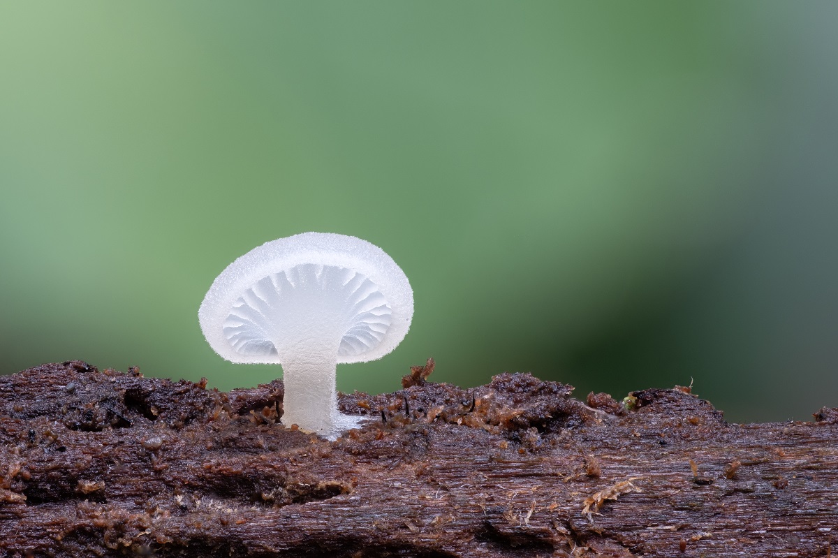 am Wochenende habe ich auf einem morschen Laubholzstamm (dort wuchsen Buchen, Eichen und Erlen) auf der Unterseite mehrere weiße Pilze entdeckt. sie waren zwischen 0,5cm und 1cm im Durchmesser groß. Alle waren rein weiß. Leider habe ich keine mitgenommen, um das Sporenpulver anzuschauen. Ich vermute jedoch, dass es weiß sein würde (damit würden die Stummelfüßchen schon mal ausscheiden). Ungewöhnlich scheinen mir die ausgeprägten Füße zu sein, die alle der Pilze hatten. Zwei Exemplare habe ich abgelichtet: