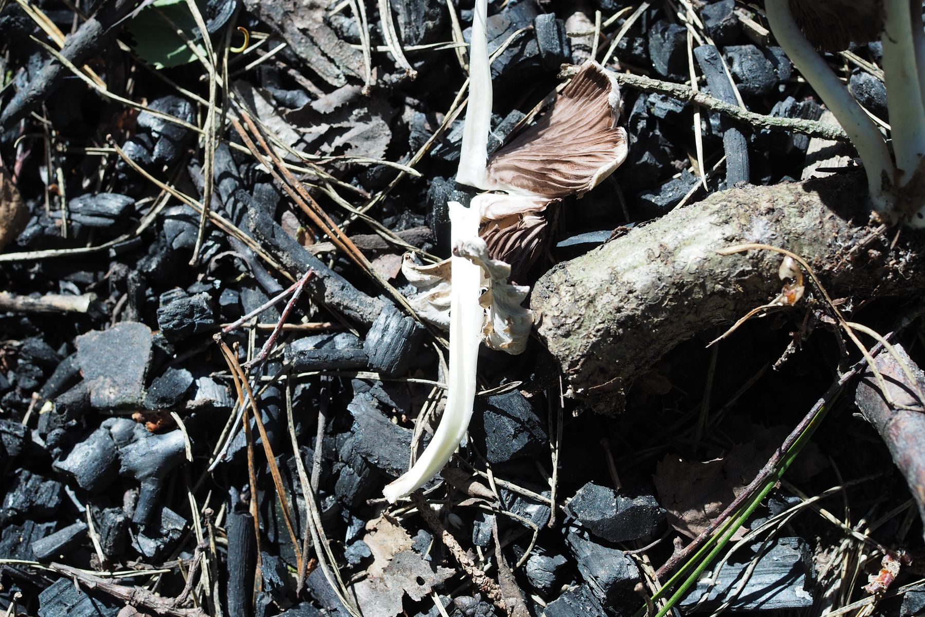 Anfang Juli habe ich auf Brandresten einen auf Holz wachsenden Lamellenpilz gefunden, den ich nicht zuordnen kann.