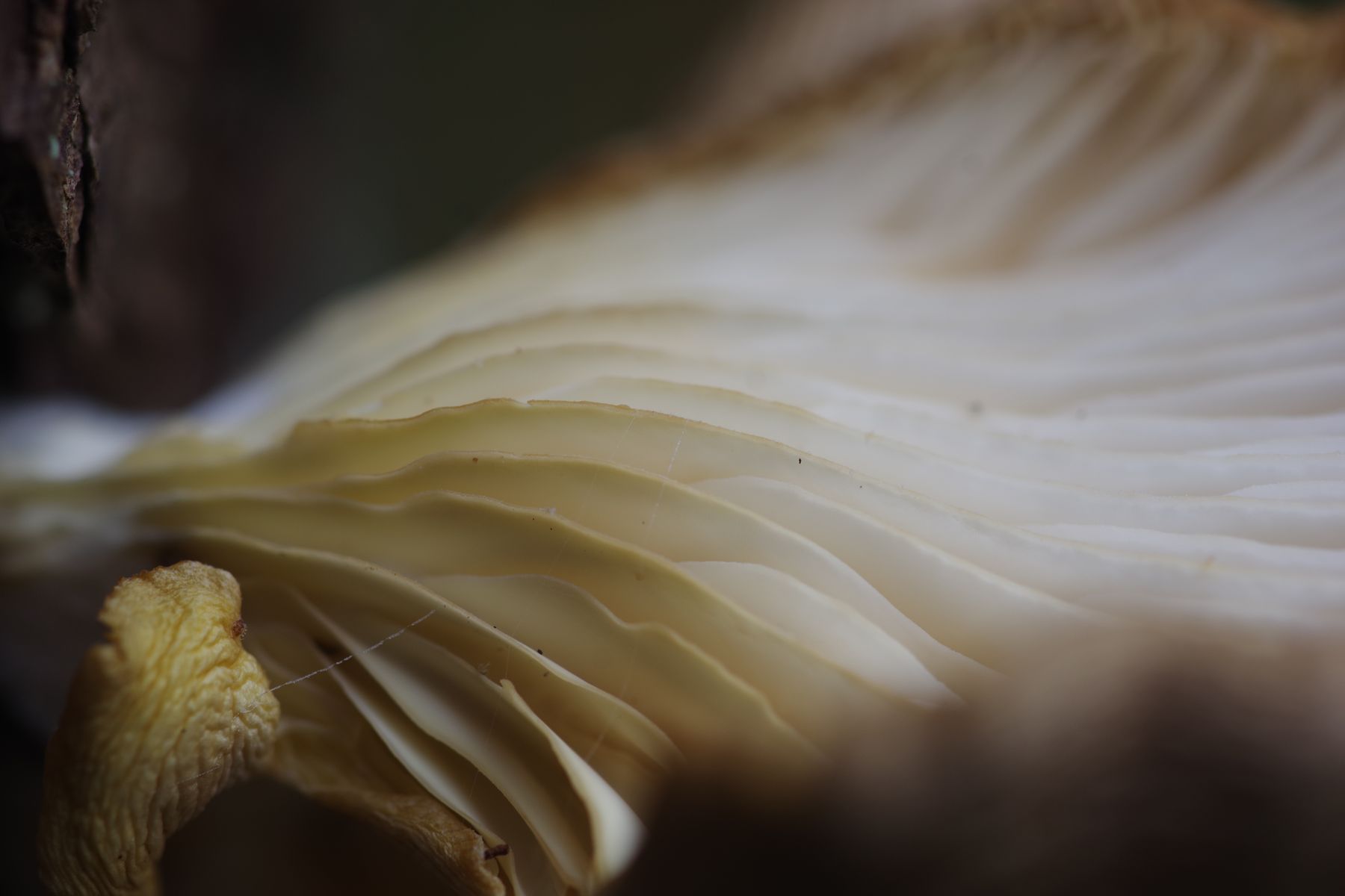 im Sommer hatte ich den schon an Fichte in Nachbars Wald, aber ohne Foto und dann waren die alle hin. Nun am Fichtenklotz beim Brennholz. Kein Stiel, Lamellen nicht gesägt und Sporenpulver weiß. Damit dürfte doch außer Pleurocybella porrigens nichts mehr in Frage kommen. Oder?
