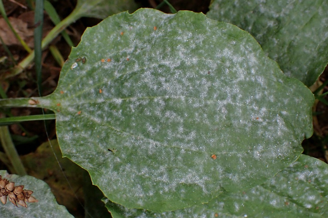 Damit lande ich bei Golovinomyces sordidus, dem Echten Breitwegerich-Mehltau.
