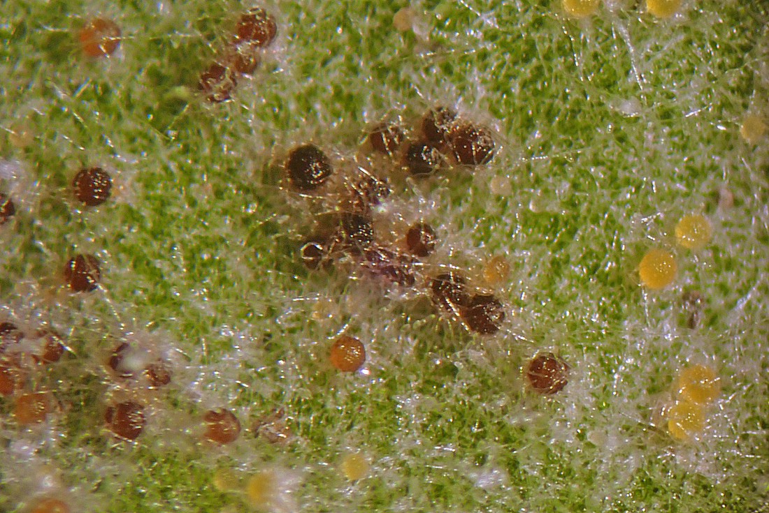 Auf der Blattunterseite fand ich einige Chasmothecien (ehemals Cleistothecien) in unterschiedlichen Reifephasen.