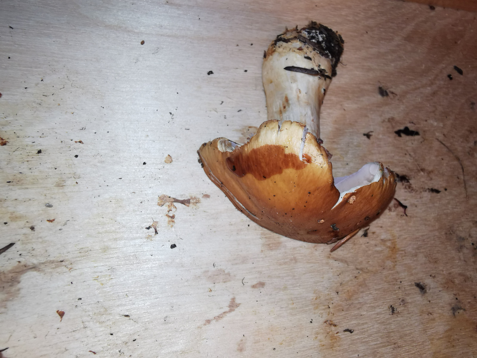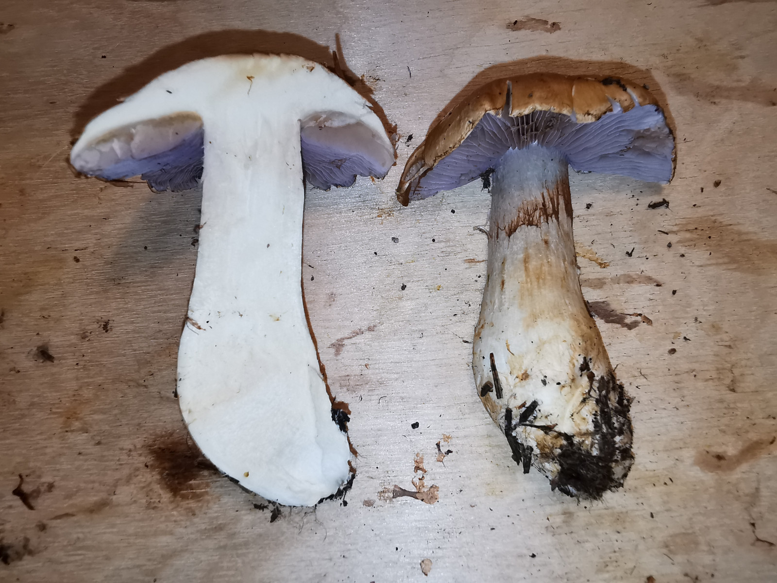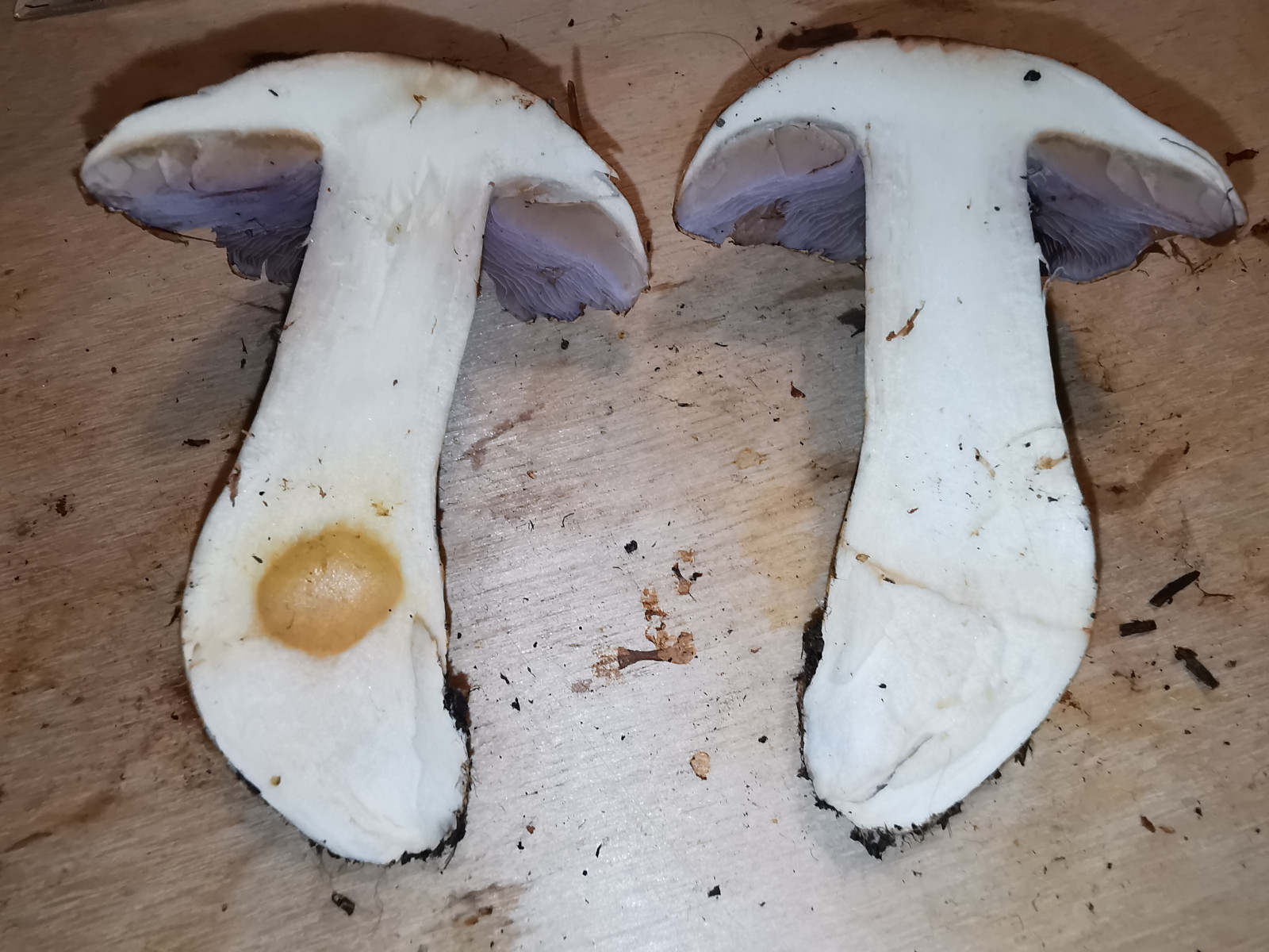 Beim Sielansatz sieht man schön den typischen violettlichen Ring. Das Fleisch schön rein weiss, Semmelbraune Hutfarbe.