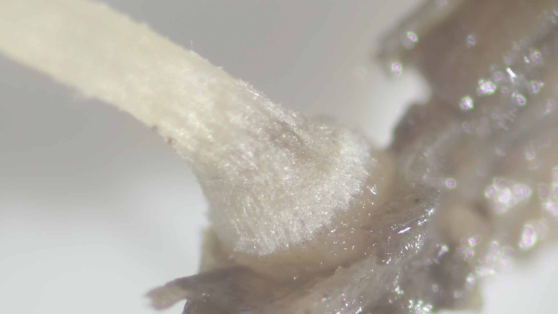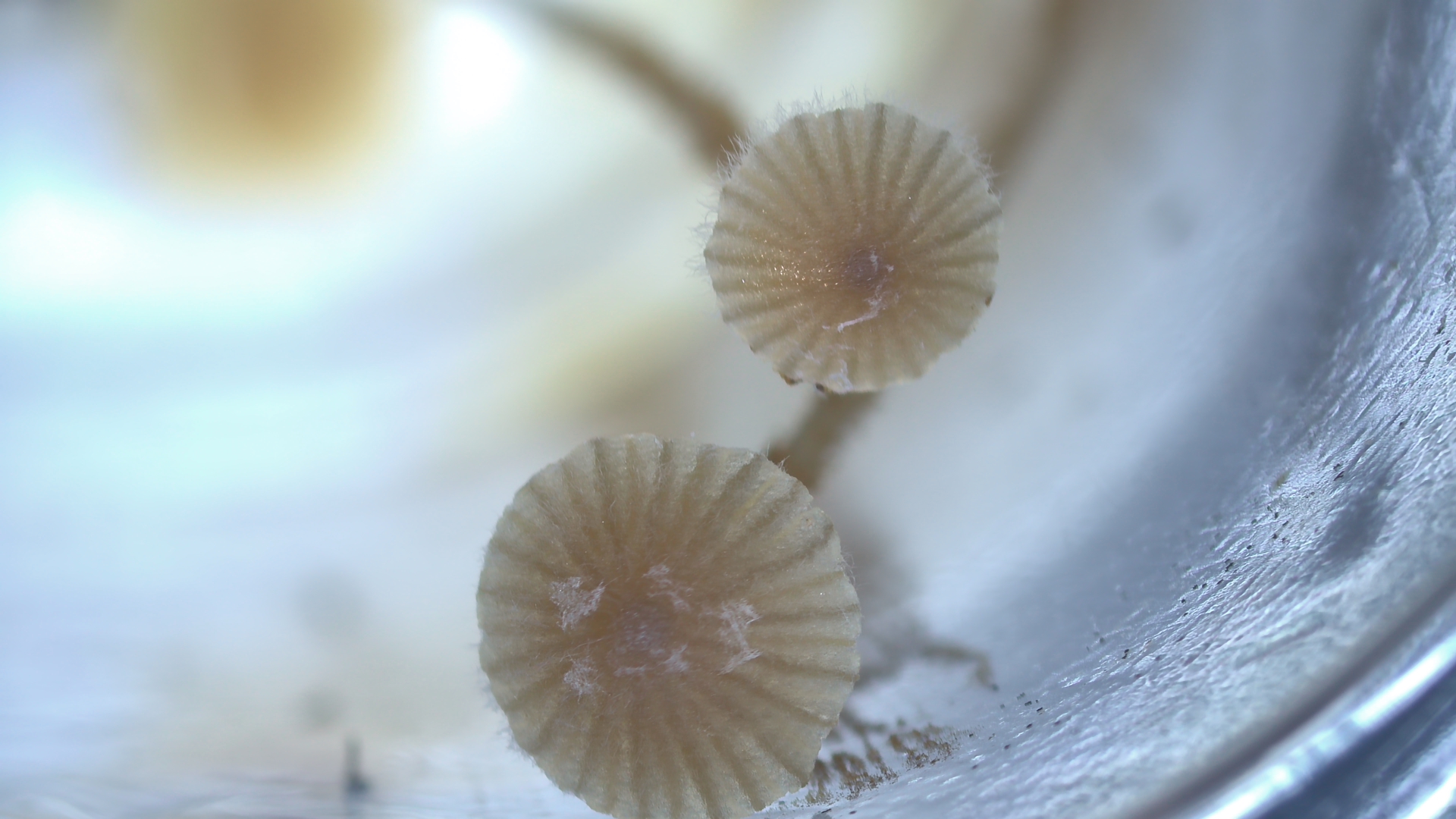 Fruchtkörper / Habitus / Wachstumsform: Hütchen 3mm, Stiel 5cm lang und 0.5mm dick (wahrscheinlich so lang weil in Kultur gewachsen)