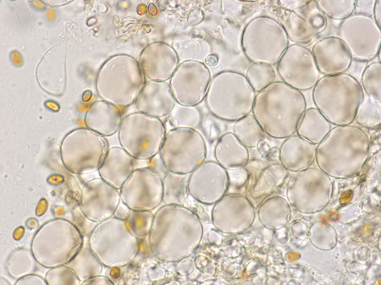 Cheilozystiden: spärlich vorhanden mit kleinem Kopf bis 4 µm und Bauch bis 9-10 µm