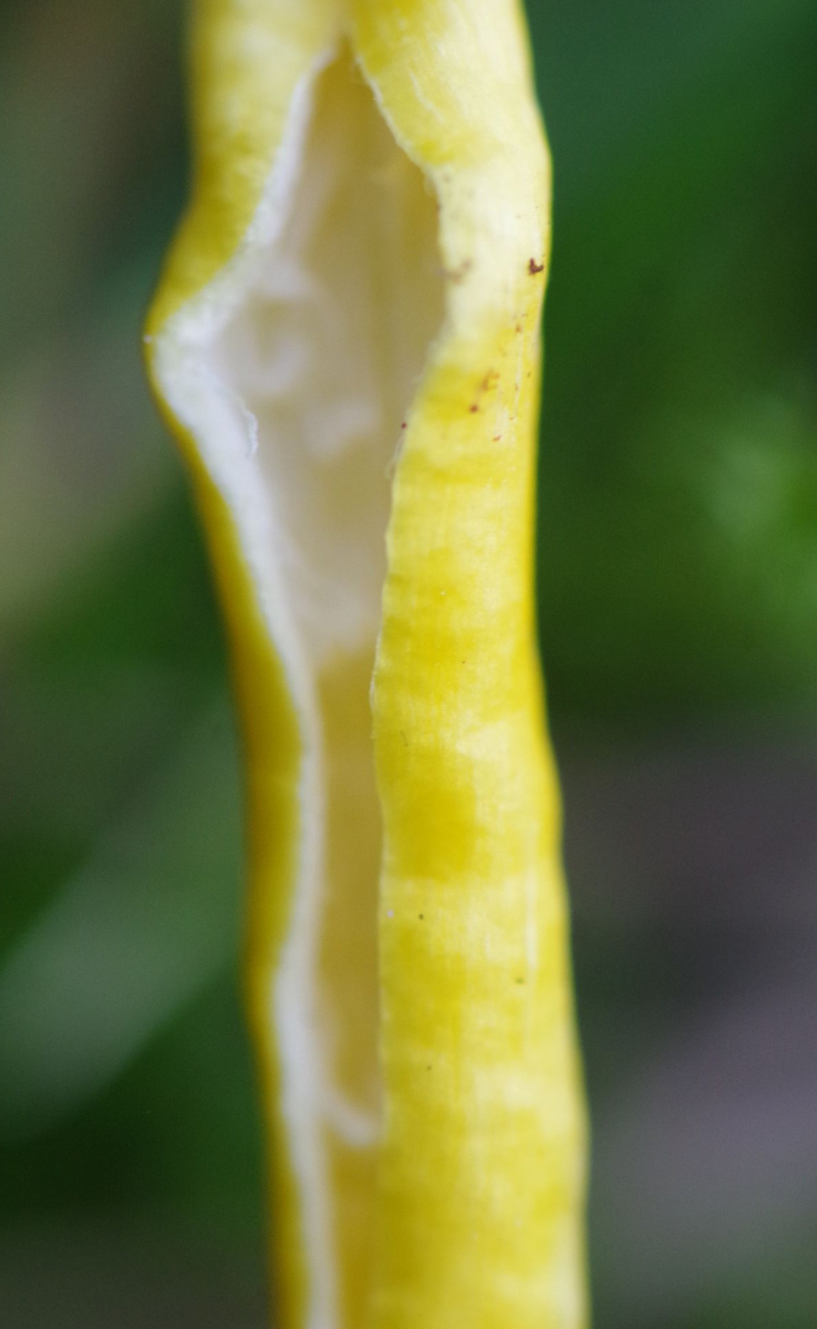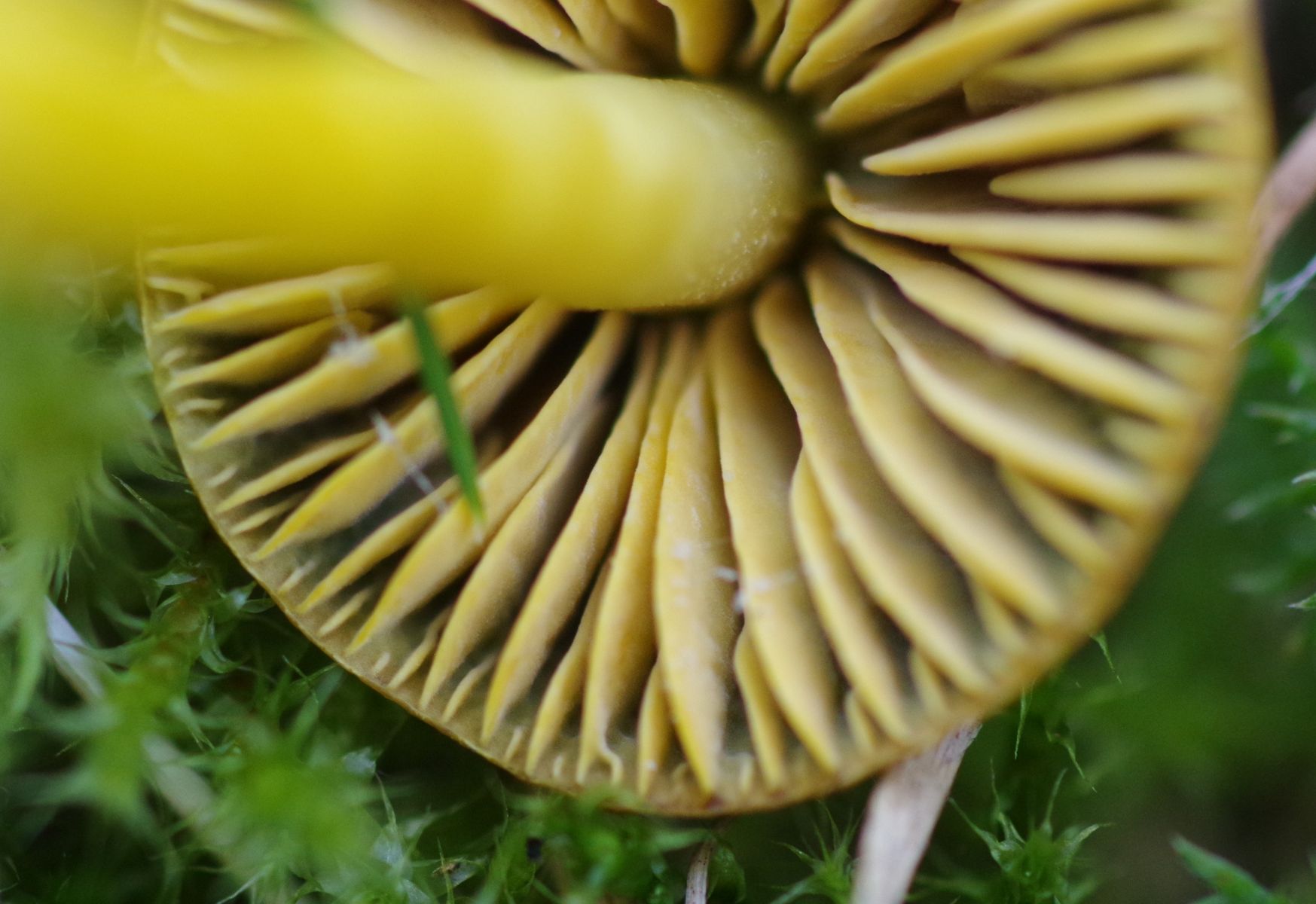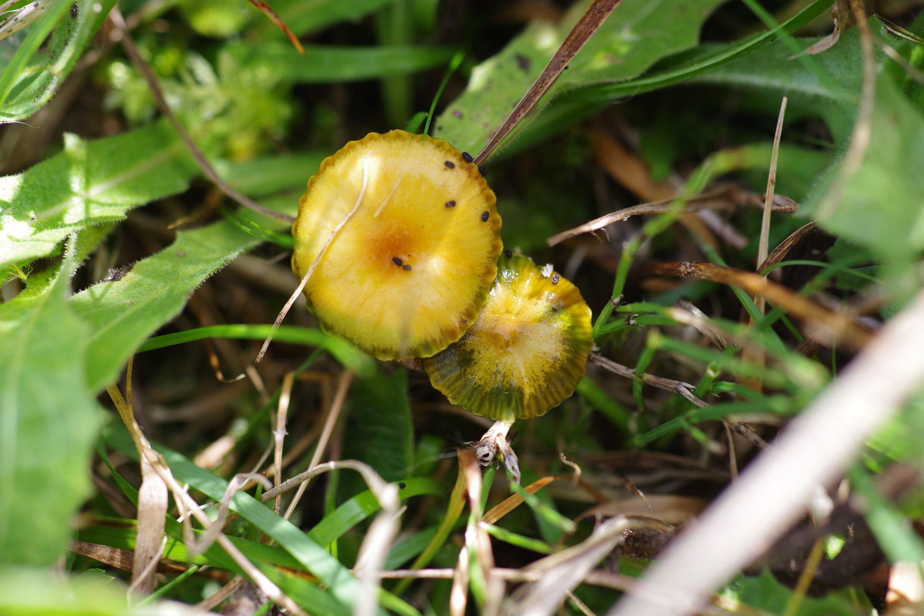 Einzig dieser hier ist relativ ausgeprägt, so dass vielleicht jemand auch anhand der Fotos einen Arbeitsnamen vorschlagen kann. Auffällig zunächst der helmförmige Hut, der bei etwas älteren Exemplaren kreuzförmig eingerissen ist - nein, es war nicht trocken, die Papageien sehen auch normal feucht aus. Selbst der hohle und faserige Stiel ist aufgerissen, da habe ich nicht nachgeholfen. Geruch habe ich keinen festgestellt. Die Lamellen sind frei und leicht queradrig. Hut ~15 mm im Durchmesser, Stiel 50 mm.